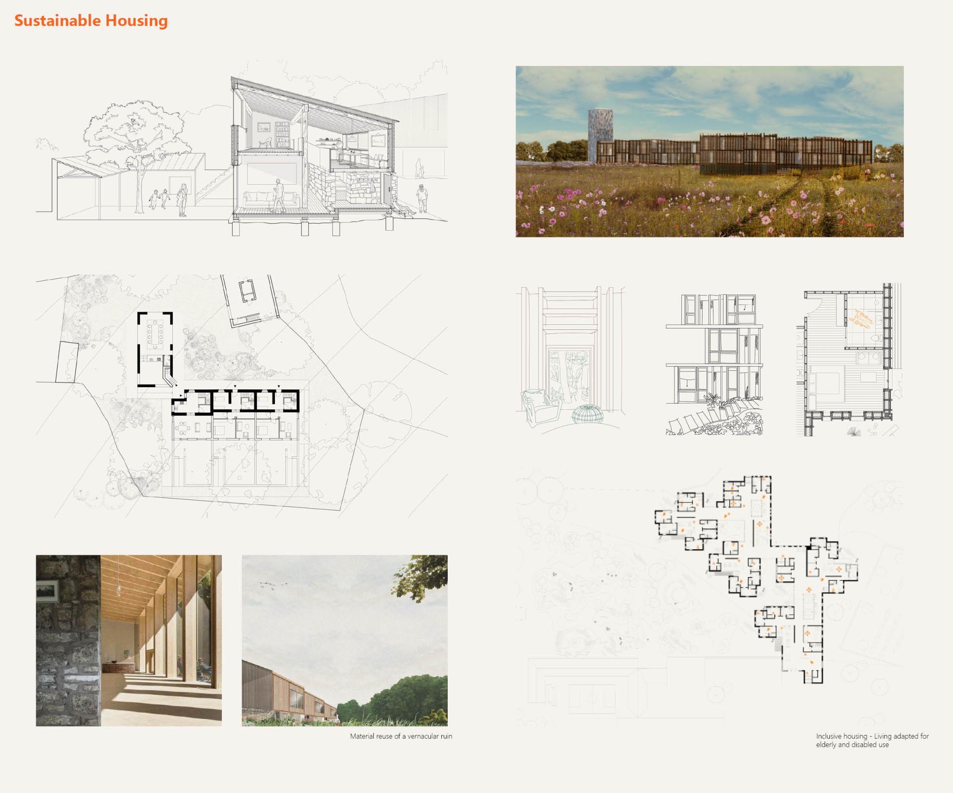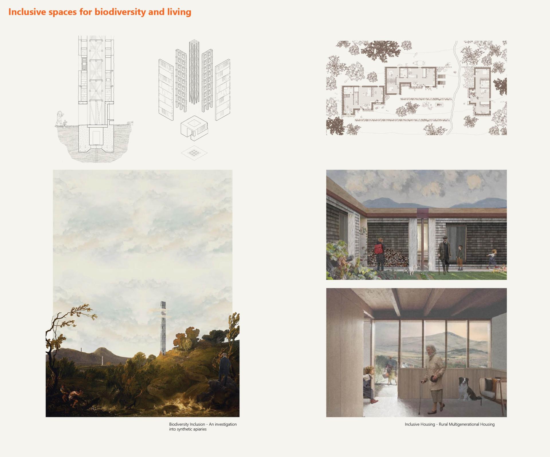 In terms of the inclusion and reintroduction of biodiversity into the landscape of Carlow a series of exciting and radical projects were carried out. A response across the two years of work surrounding land-use, biodiversity and its role in the built environment is based on accepting that nature needs a helping hand: our regenerative design can be proactive and accept that not all ecosystems can right themselves, nor have the luxury of time to do so. In this sense, a vast majority of our work has centered on proactive approaches to climate care and land stewardship. From reforestation, modern artificial farming methods, the promotion and protection of specific flora and fauna as well as some broader conceptual schemes of bringing natural life into cities, towns, and everyday lives. Our approach to housing was to create cohesive inclusive communities in urban or rural environments. The inclusion and redevelopment of the counties’ existing historical fabric was a key starting point in establishing sustainable housing typologies. A primacy was placed upon densifying urban and rural town centres through innovative inclusive models such as socially-integrated elderly housing for an aging population, multigenerational typologies in both urban and rural agricultural contexts, emergency accommodation for climate refugees, and direct provision centres for asylum seekers. Our aim was for an inclusive built environment regardless of age, disability, social, economic, or cultural background.