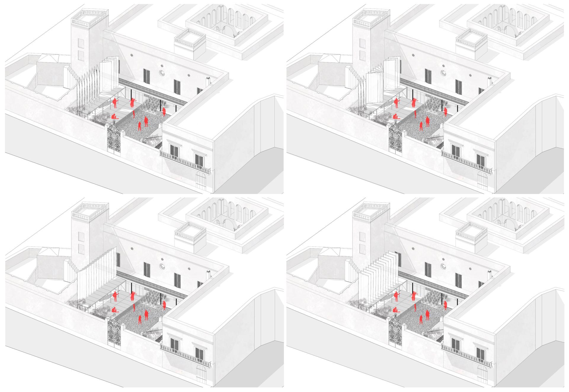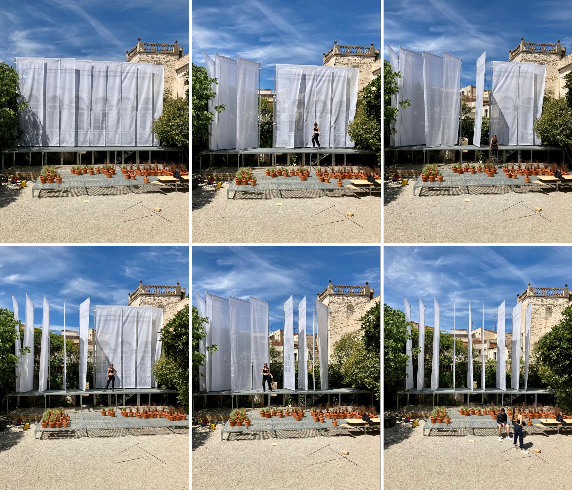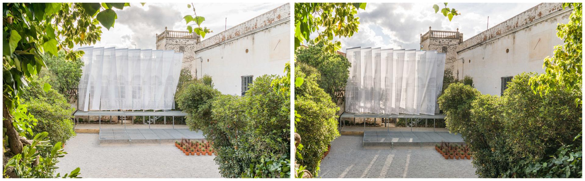 In order to achieve this aim, the project is composed of four main moves: clearing rubble and overgrowth to make the patio of the manor house accessible; installing large-scale textile flags to identify the intervention; building two-level stages to facilitate its use for arts and culture; and introducing a large number of potted plants to enhance the environmental quality of the place.