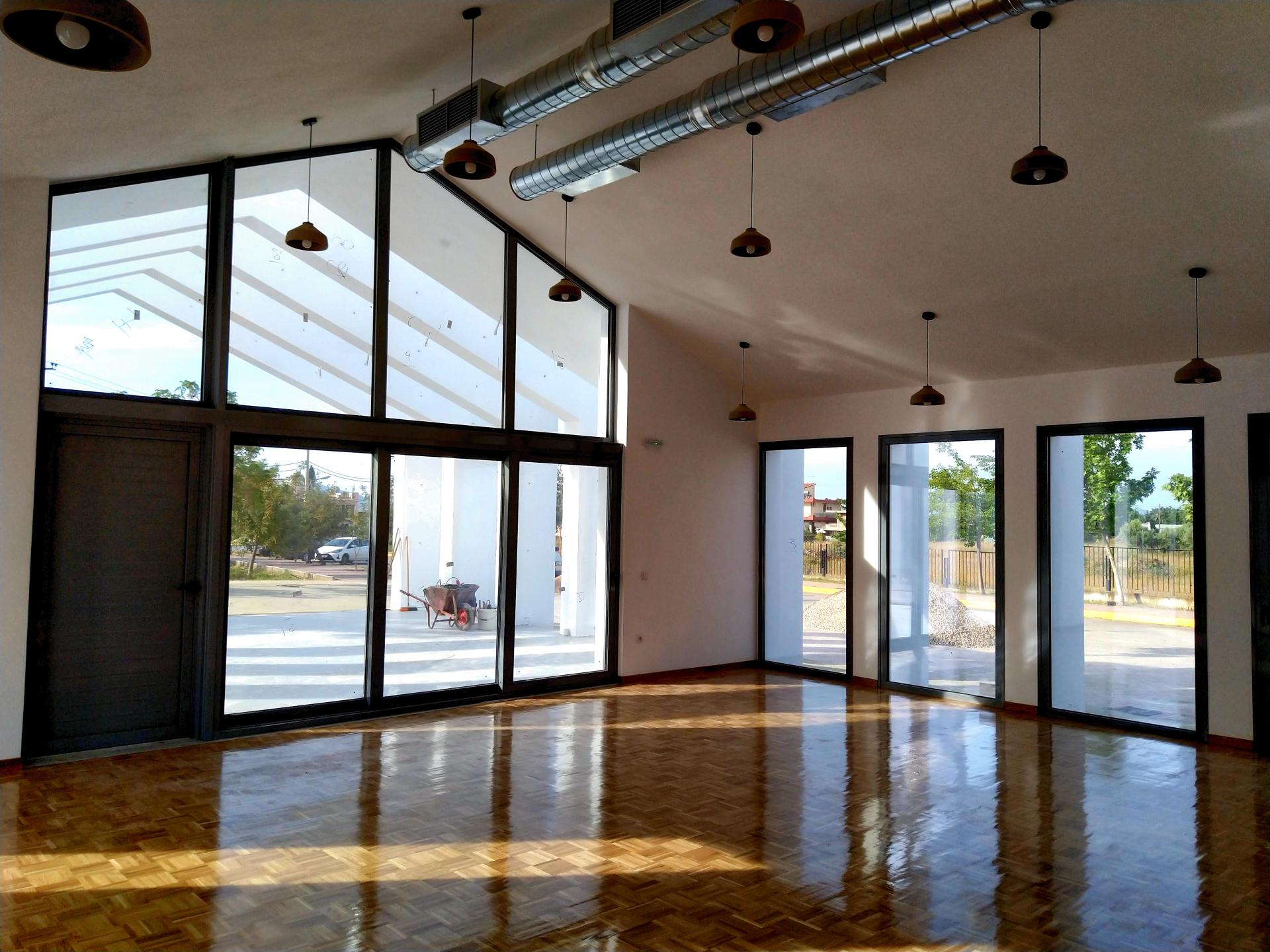 In terms of energy performance, the building is compliant to the low energy consumption directions of the Greek state. There is a 6cm insulation covering the interior volume of the building, the structural frames provide shade to all the windows and the exterior frames, combined with jasmine climbing plants provide sun shelter to the courtyard. The hot water of the building is provided by solar panels and the hall is air conditioned by low power VRV units. The ventilation system is connected to a heat exchange system. All the exterior HVAC systems are non-visible, hidden between the structural frame and a lower height roof.