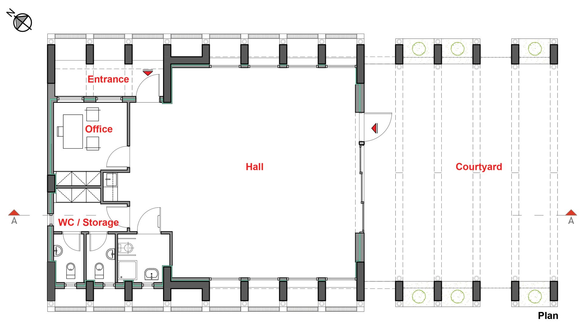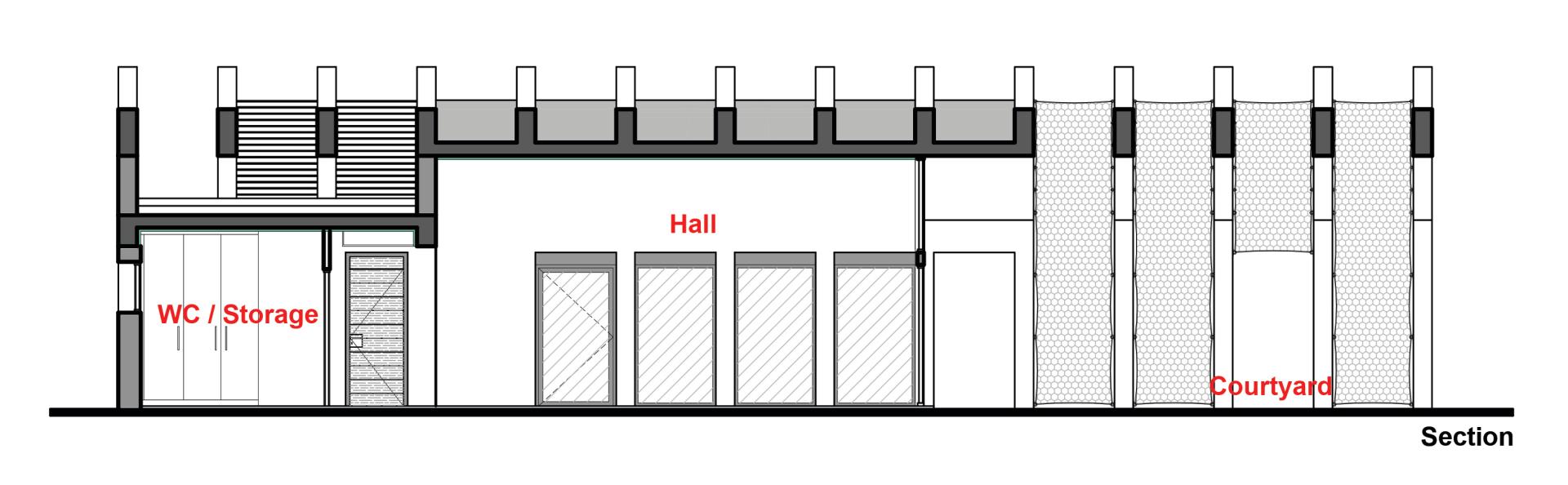 The building is a single volume consisting of repeating structural frames. Auxiliary spaces are placed at the northern side (office, storage, WC), the rehearsal hall is placed at the centre of the building and at the south side there is an open area with the ability to be easily sheltered if needed.