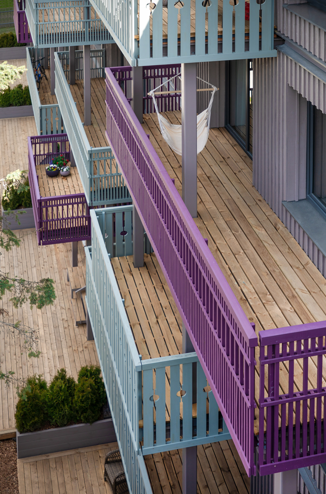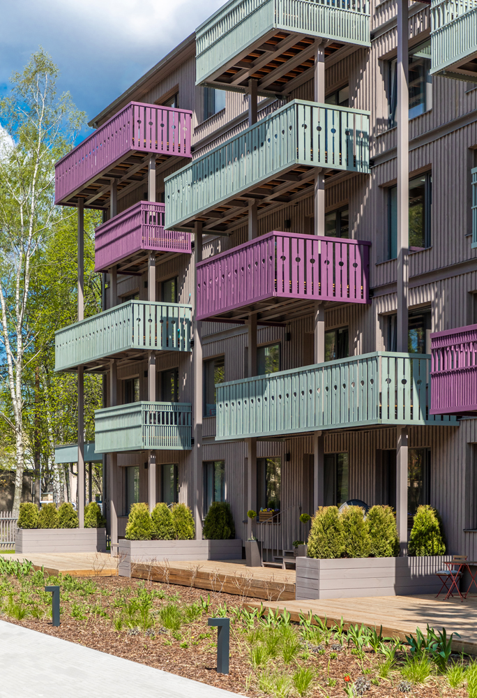 Jūrmala draws people with its historical architecture – the wooden villas and cottages associated with its development as a resort town. Instead of competing for attention, we chose to respect the context and reference the town’s past in our design. This is one reason why we opted for timber for the cladding and balconies, which are colourful. They nod to the vernacular architecture and its intricate carved wooden latticework.