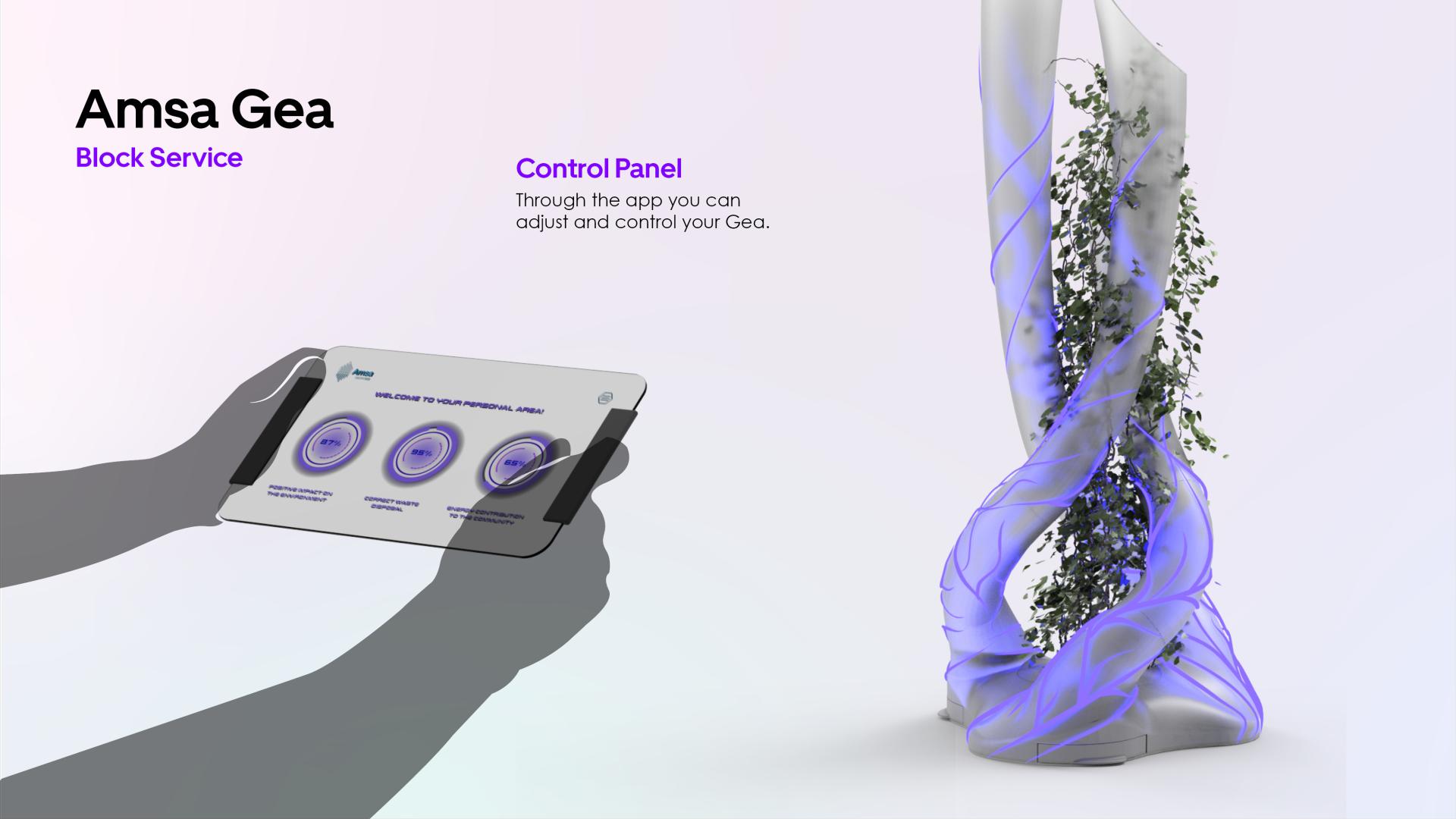 The team imagined Gea as a product owned by Amsa, a Milan's environmental services company. In the concept, Amsa propose a service in which Gea can also be controlled and managed through a tablet that allows the user to observe Gea's activity during digestion and its contribution to the building. Infact, at the entrance to each apartment block there are several biomass collection totems. People insert their own biomass-filled drawers and take an empty one to replace it in their Gea. When the totem is saturated with biomass, AMSA goes to the apartment block to collect it and place a new empty totem. The biomass is transformed into energy for the whole building.