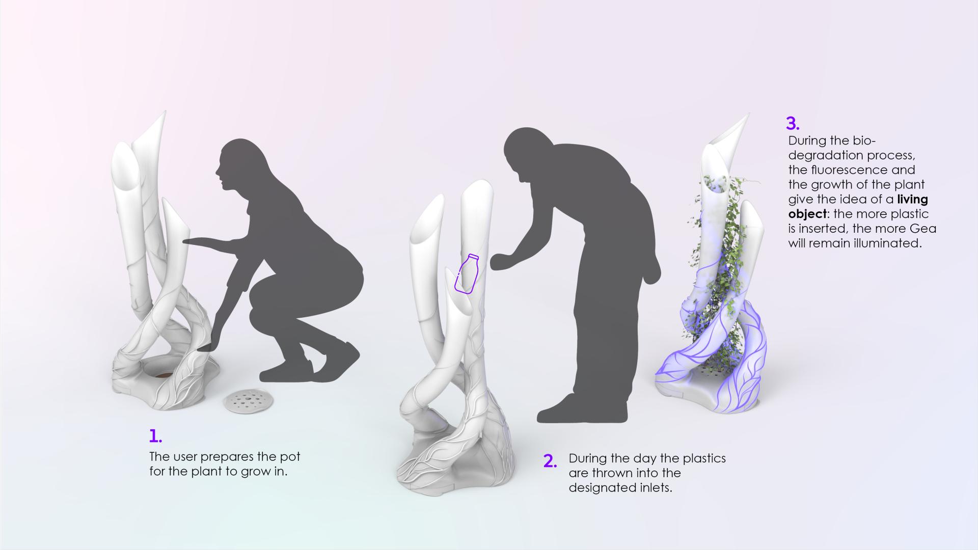Gea is a new household element that introduces the concept of technology as a bridge, enabling the symbiosis between man and nature, which continuously benefit each other. Using innovative bacterial biodegradation technology, householders dispose plastic waste without polluting the environment, but on the contrary by nourishing it. Through advanced technological development, man and nature benefit each other.