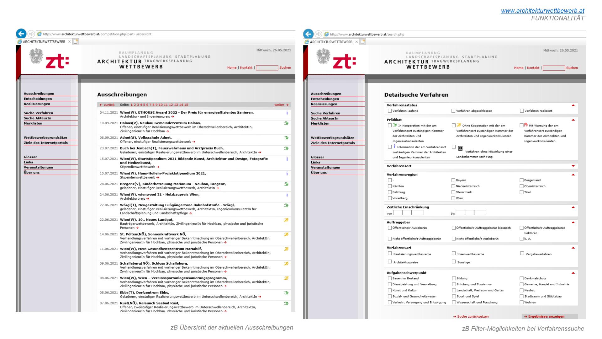 The “Architekturwettbewerb.at” platform is a supporting tool for architects and public and private clients with the aim of simplifying, improving and thus enhancing the use of Architectural Design Competitions as an efficient way to support design and co-creation for more sustainable building and planning processes. Thus, it is an important instrument for enhancing sustainable architectural quality.