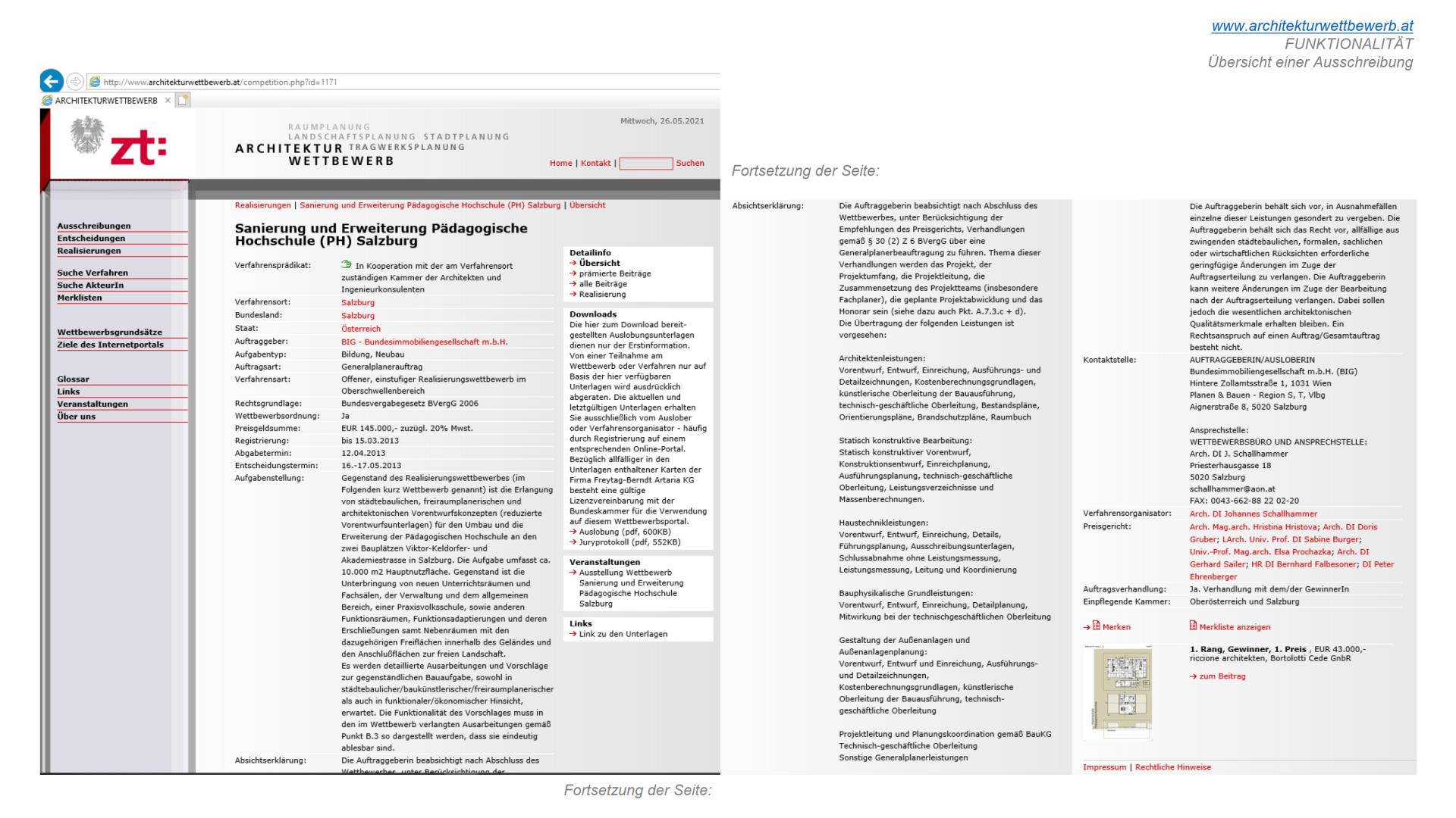 The platform goes far beyond the simple collection of data and information and offers an active and holistic approach to Architectural Design Competitions. It is a learning and working tool that evolves with each new entry and is not comparable with simpler databases for calls for ADC and other procurement procedures because of the fact that each documented procedure is evaluated by the expert competition committees on the basis of the “Competition Standard for Architecture” and the results are freely accessible.