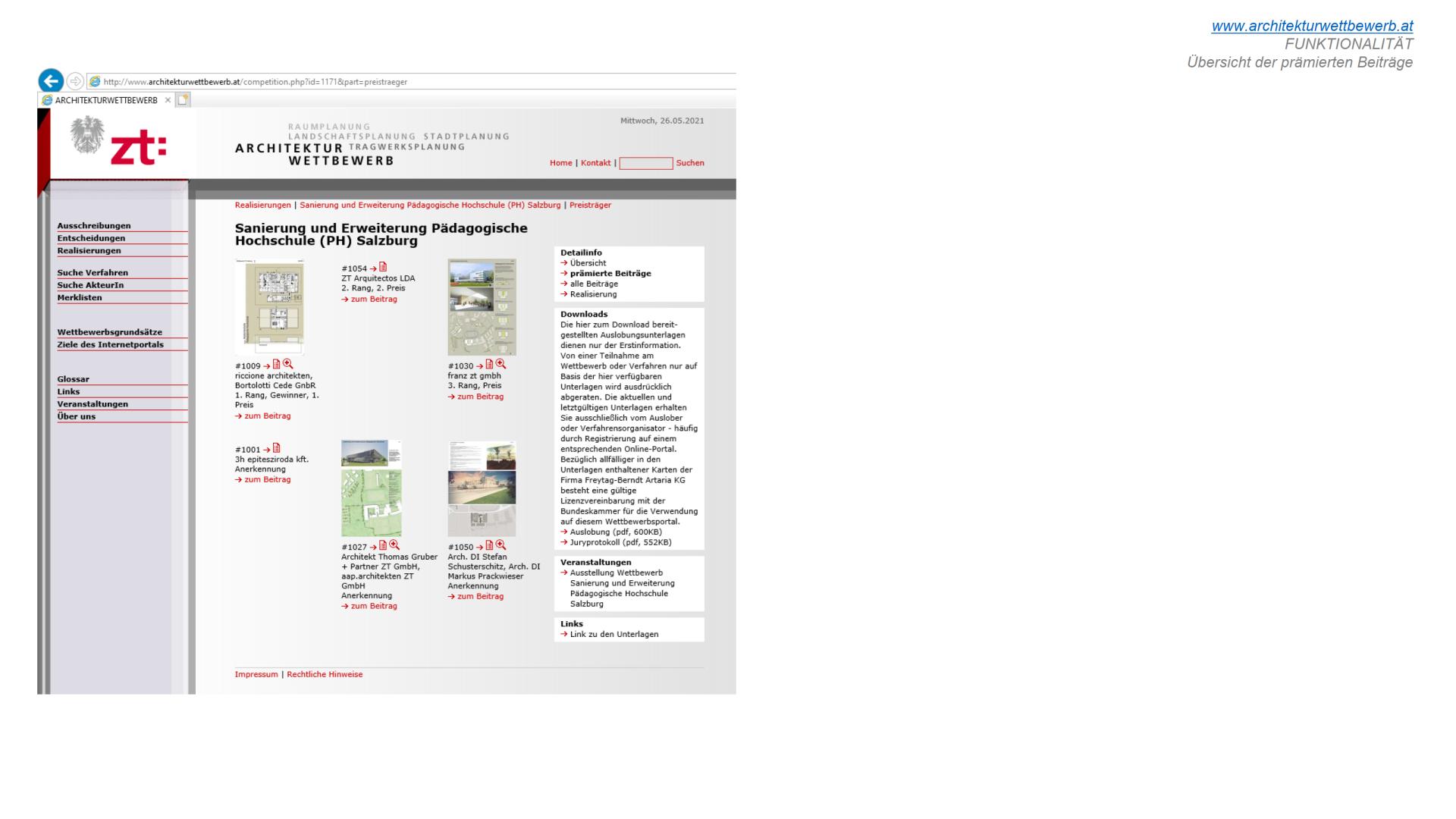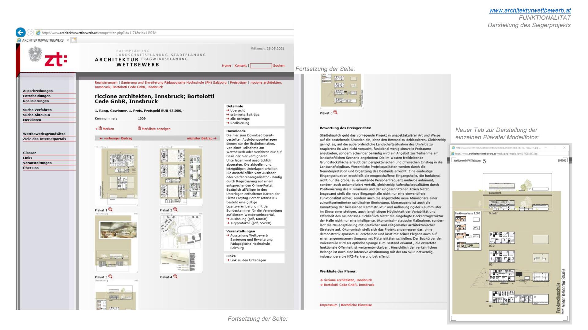 The platform is also a reference book as well as a constantly available online-exhibition with Best-Practise-Examples. After the relaunch it will be possible to also compose individual online-exhibitions on various topics (e.g., educational buildings, housing, ..) and regions.