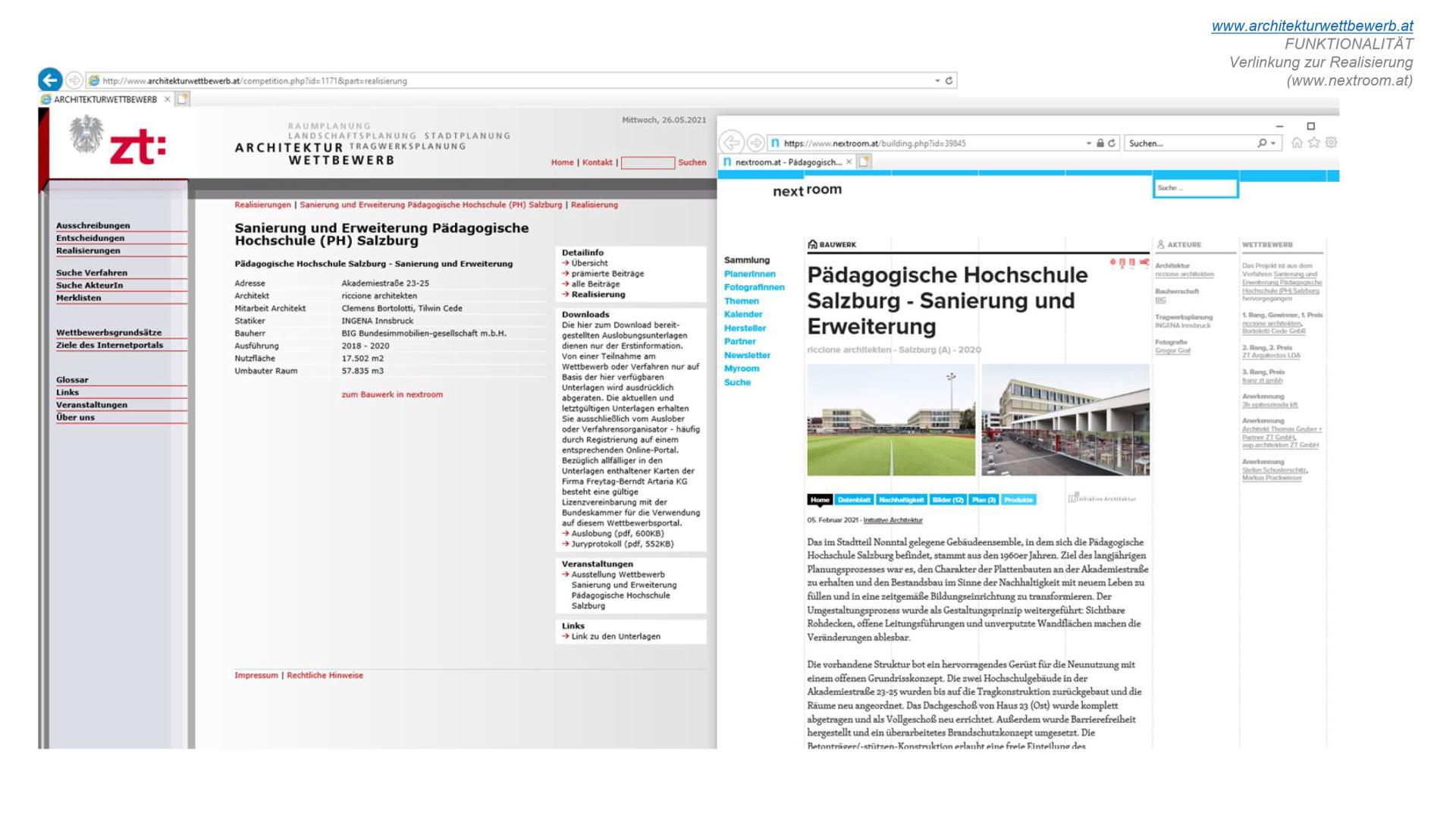 Every single competition is documented with all submitted projects including the winning schemes and the realisation of the winning project and is added to an archive dating back to 2005.The documentation of the realisations is provided in cooperation with https://www.nextroom.at/.
