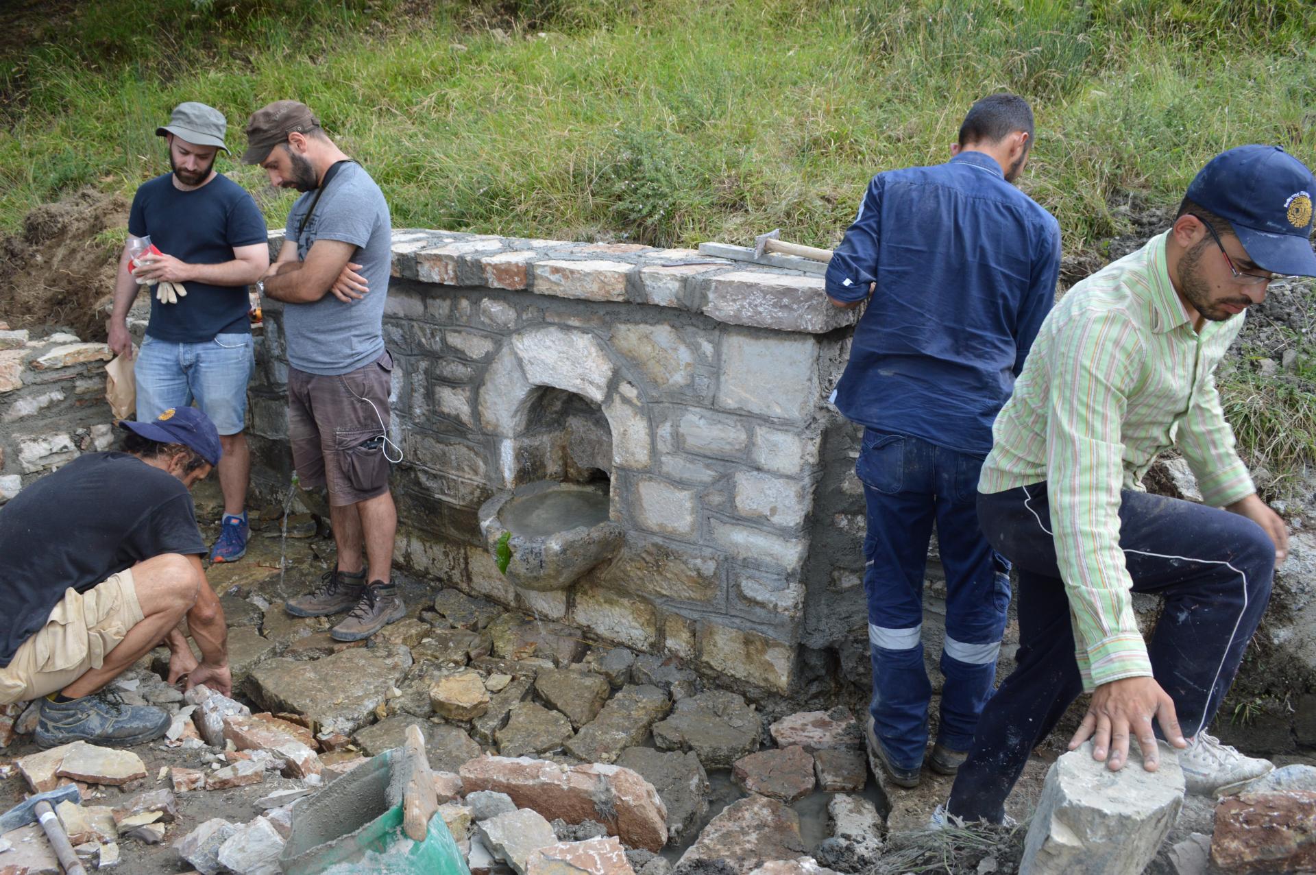 - Three on site, yearly rolling hands-on workshops of vocational training on traditional stonemasonry, with the active and extended participation of local citizens, experienced stonemasons, students, local enterprises, as well as the local authorities. These workshops aimed in strategically reactivating traditional stonemasonry, a characteristic monoculture of Lagadia settlement and still a basic trait of local identity, followed by tangible results in the form of delivering for public use, fully restored infrastructure: a stone threshing floor, a fountain, and a cobblestone path,