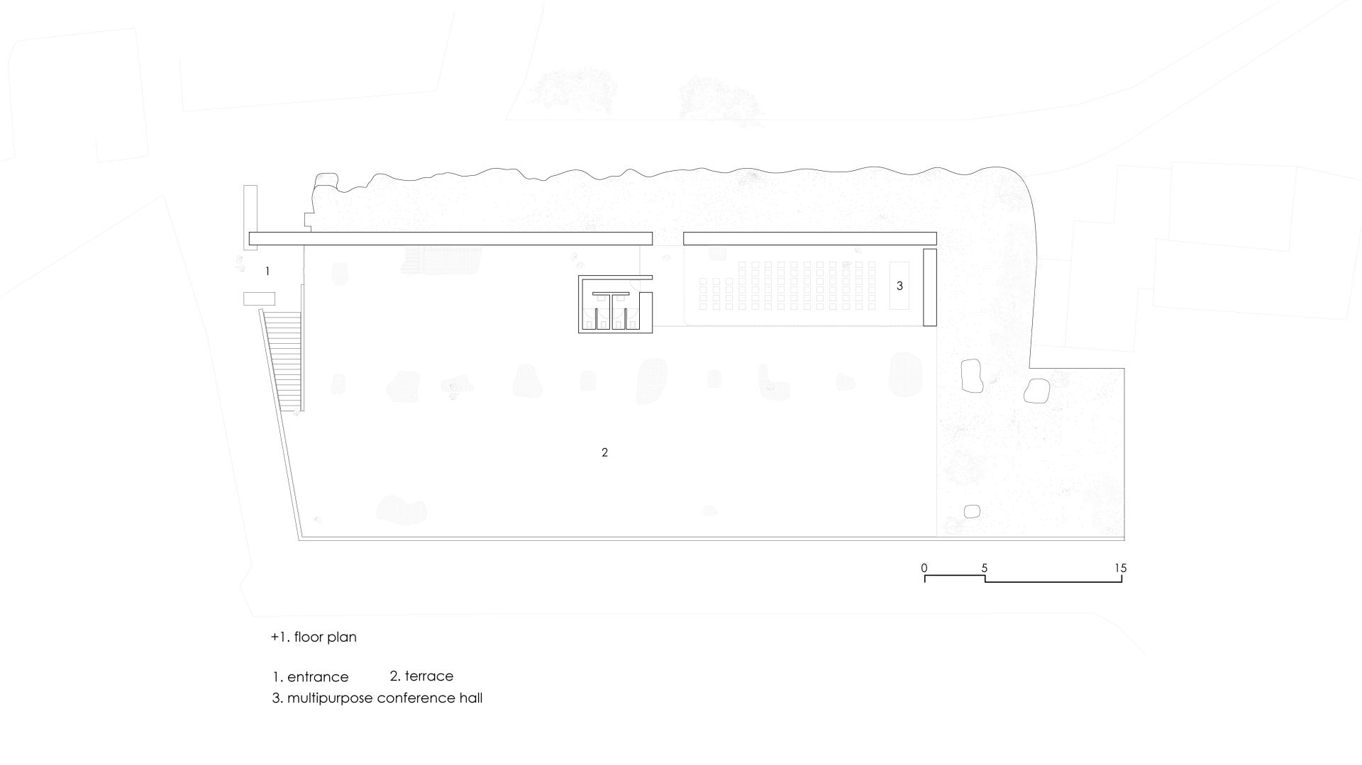 A dialogue is generated between the structure and the surrounding, keeping the horizontal roof typology by discreetly determining the building height according to the ridgeline of Bacoli, a town in need of new communal spaces. The roof is freely accessible and offers both indoor and outdoor space for events, gatherings, discussions and enjoyment of the view.