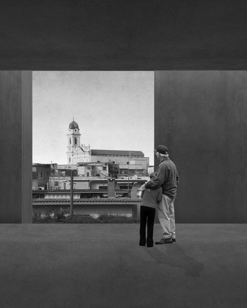 Inspired by the existing structure and the material of the cistern (cocciopesto), a volume consisting of three massive structural walls, is places on the roof terrace, accentuating the main viewing axes of the landscape, creating an open public space for cultural use. The choice of material "cocciopesto" and the thickness of the walls allow to regulate the temperature in summer and winter in the building, without additional heating and cooling methods.