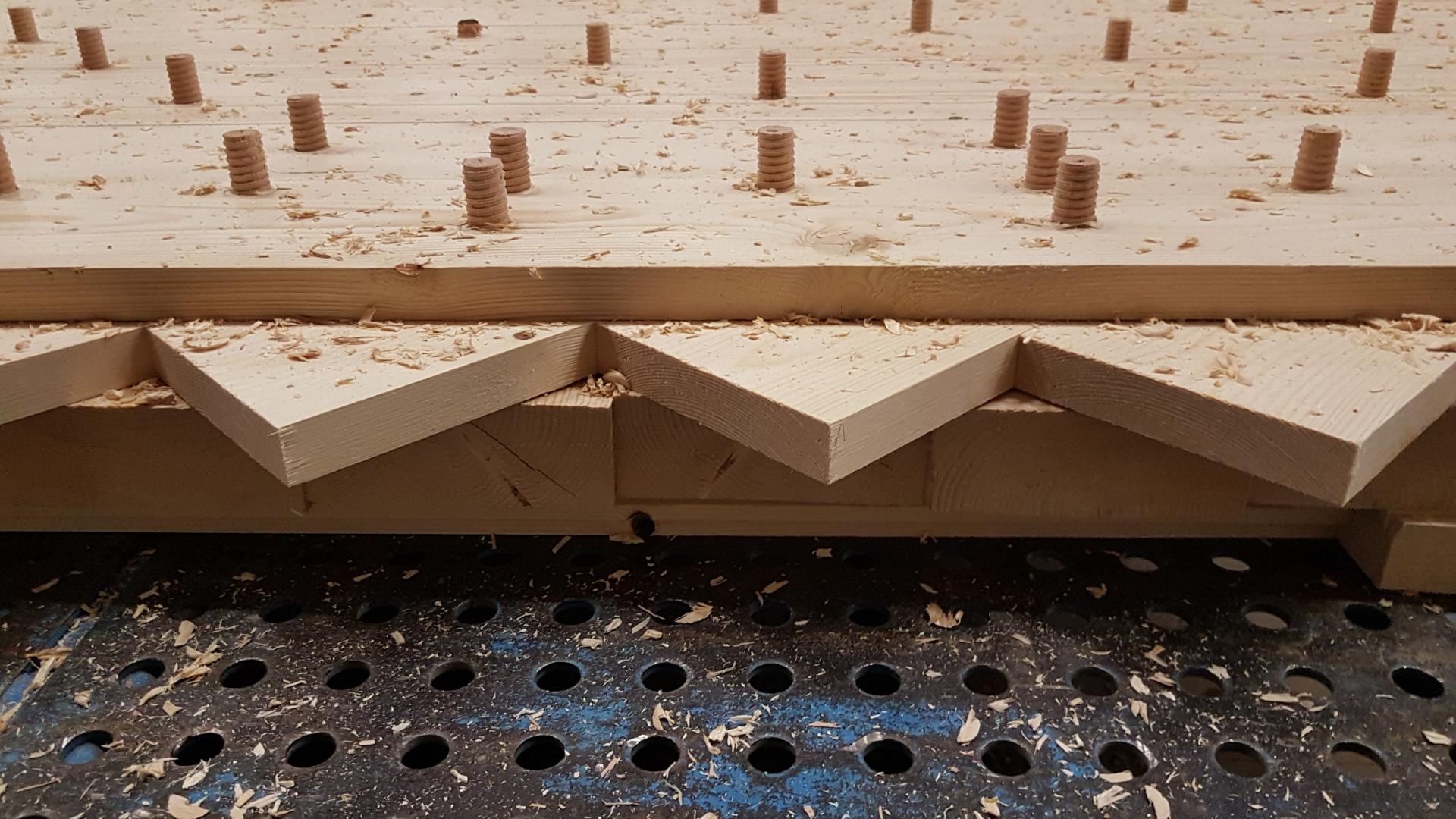 The elements have a thick wooden core and two pine wood planks attached cross-angled to each side. They are connected using long beech screws. Not a drop of glue is used. The wooden screws absorb the residual moisture in the spruce boards, fixing them in place. The screws are just a little shorter than the wooden element, so they are not visible.