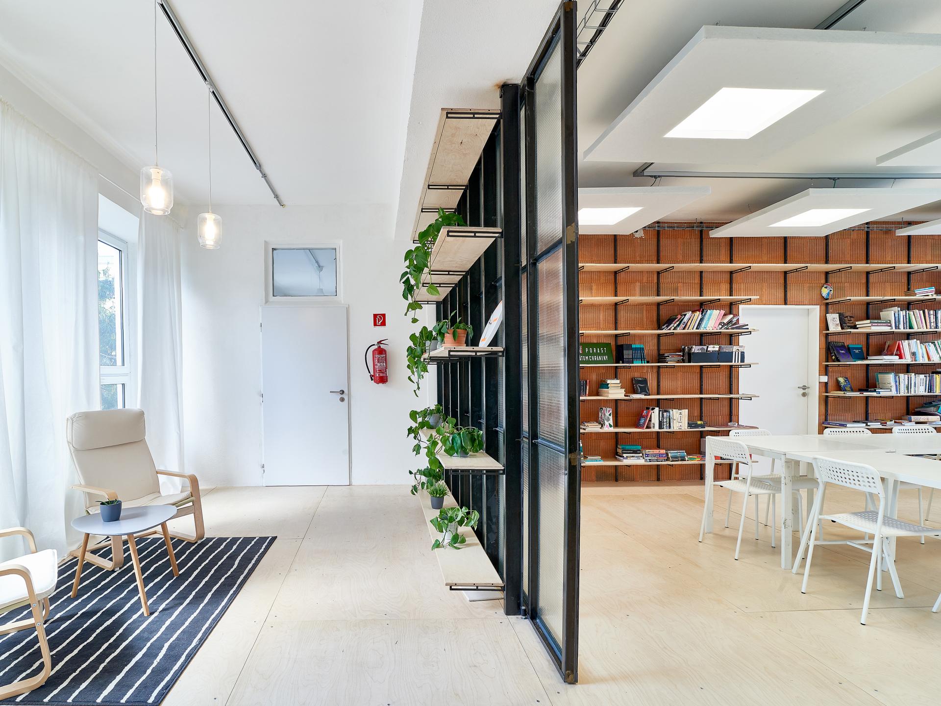 We moved warehouse space from the dark basement to the place under the kitchen, suitable in case of noisy works. it enables the opportunity of a gastro area, too, which could serve as a public shared space.