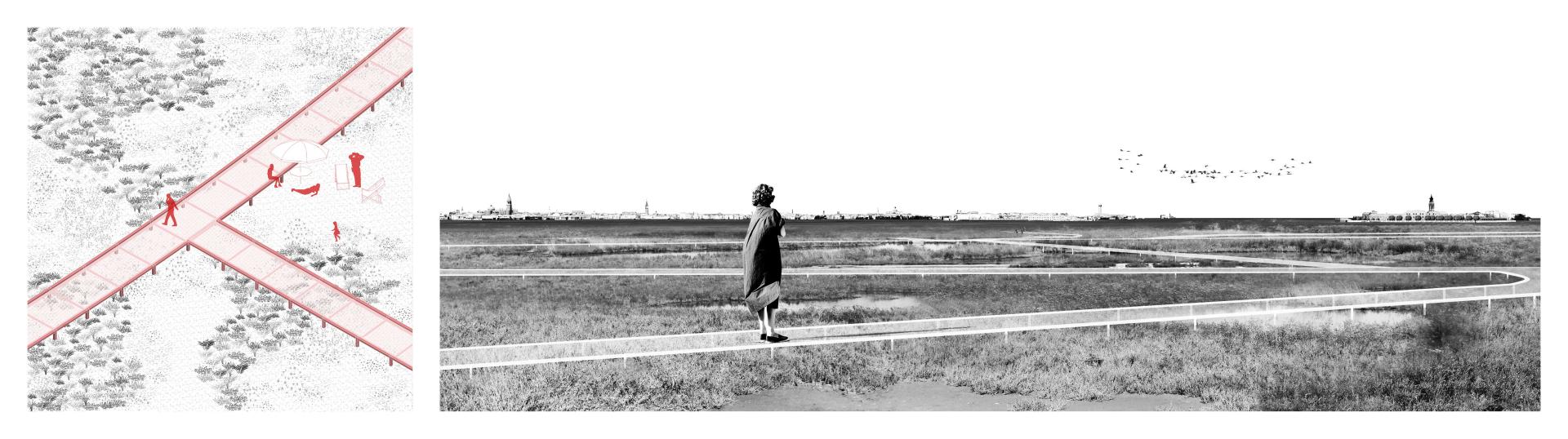 "The Agency of Barene" proposes within its framework the understanding and the design application of the "sense of lagoon”: a set of logics, rhythms, processes, time and spatial dimensions characterizing the Venetian Lagoon. Aesthetically, three formal characteristics defining the image of the lagoon landscape have been integrated into the project proposal: the concepts of horizontality, visibility, reflection. Therefore, through the project, the observer is accompanied in the experience of deepening the aesthetic character of the lagoon environment, on the muddy soils of the brackish marshlands.