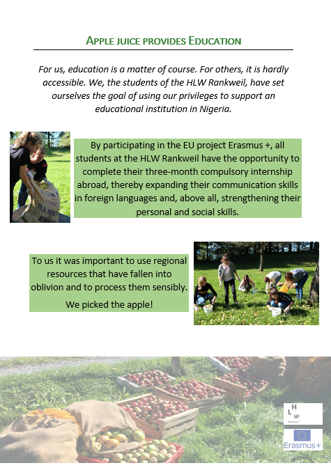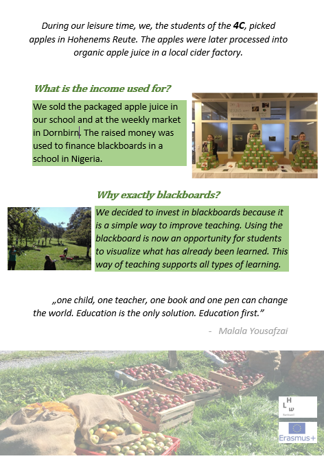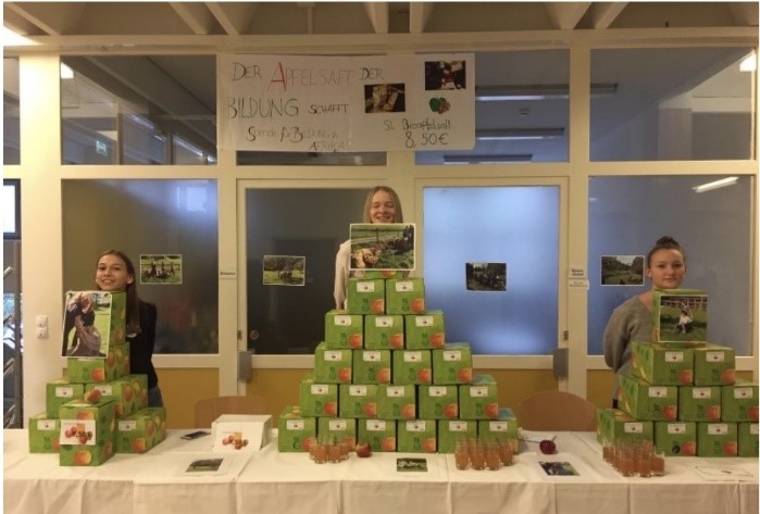 We sold the packaged apple juice in our school and at the weekly market in Dornbirn. The raised money was used to finance blackboards in a school in Nigeria.