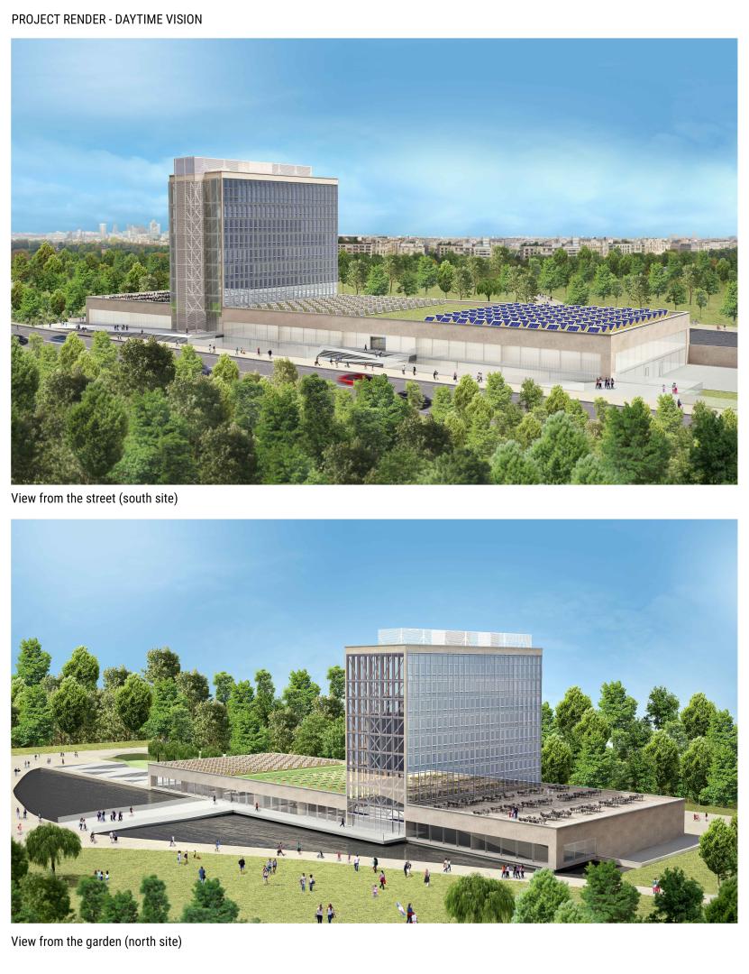 More generally, the different technological and architectural solutions implemented in the different parts of the building (structural conservation, double skin, channel glass, skylights, green roof, water basin, ramps and paths, differentiation of façade technologies according to sun exposure, etc.) brings together functionality, environmental sustainability, historical references, aesthetics and inclusion.