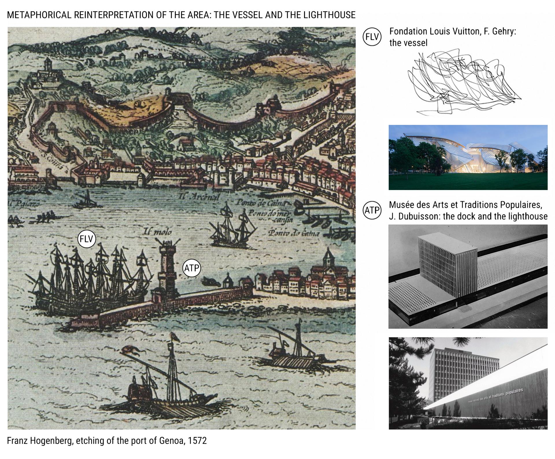 The aesthetic value of the technological choices, primary related to environmental quality, is a fundamental aspect of the project. In fact, one of the architectural ambitions of the refurbishment of the Musée des ATP is to reconcile the geometric rationality of the remaining structure with the morphological complexity of F. Gehry's Fondation Louis Vuitton, which represents a glass vessel landed in the park of the Jardin d'Acclimatation. Drawing inspiration from Hogenberg's 1572 etching of the port of Genoa, I decided to complete the metaphor by reinterpreting the Musée des ATP as the harbour pier with the lighthouse tower towards which the Fondation's 'glass vessel' is heading. In this sense, the archetypal function of the lighthouse, namely light signalling, is reinterpreted in a contemporary key, thanks to electrochromatic glasses. This technology, which minimises cooling consumption in summer, becomes a communication vector in the evening, using building's lighting to compose luminous graphics, signalling museum's position and its creative vocation. Other technological elements that meet functionality and sustainability criteria assume aesthetic relevance: the walls of the exhibition platform recall, in a translucent way, the vertical texture of the original opaque envelope through the use of channel glass, allowing natural lighting for interior spaces; the garden roof, on the exhibition platform, improves the landscape view from the top of the tower, reconciling the image of the building with the surrounding garden; the water basin, which is part of the solutions to reduce overheating in summer, becomes an element of conceptual connection with the Fondation Louis Vuitton and its aquatic area, contributing to the metaphoric lecture of the vessel and the lighthouse; finally, the original steel structure, entirely preserved and characterised by diagonal bracings, remains visible from the glass facades of the tower, like a design artefact protected by a glass case.