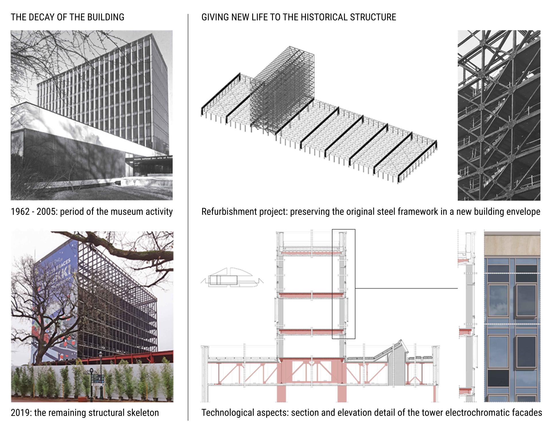 Finally, the project is historically inclusive, as it uses innovative technologies in a respectful manner of Jean Dubuisson's original design: for instance, the construction of skylights on the roof of the exhibition platform recalls those in the historic design, the electrochromatic glasses respect and enhance the modularity of the original façades, the historic structural bracings are shown behind the glass façades of the tower, and the vertical texture of the platform's opaque envelope is reinterpreted in a translucent way through the use of channel glass.
