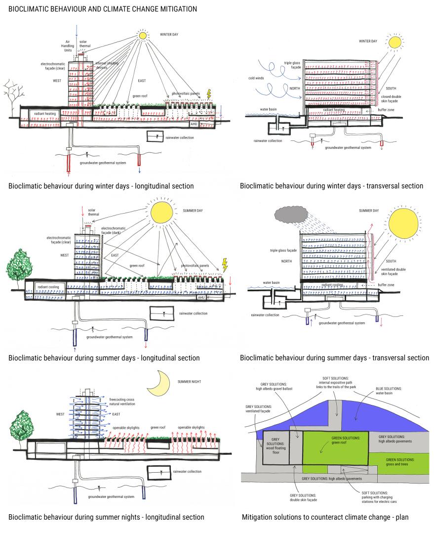 Furthermore, in order to accomplish thermal and bioclimatic regulation, the project employs geothermal energy through radiant floors systems, rainwater collection and a solar thermal system to heat sanitary water, while high-albedo materials, with low thermal inertia, vegetation insertions and water mirrors reduce urban heat island effect and safeguard population from heatwaves.