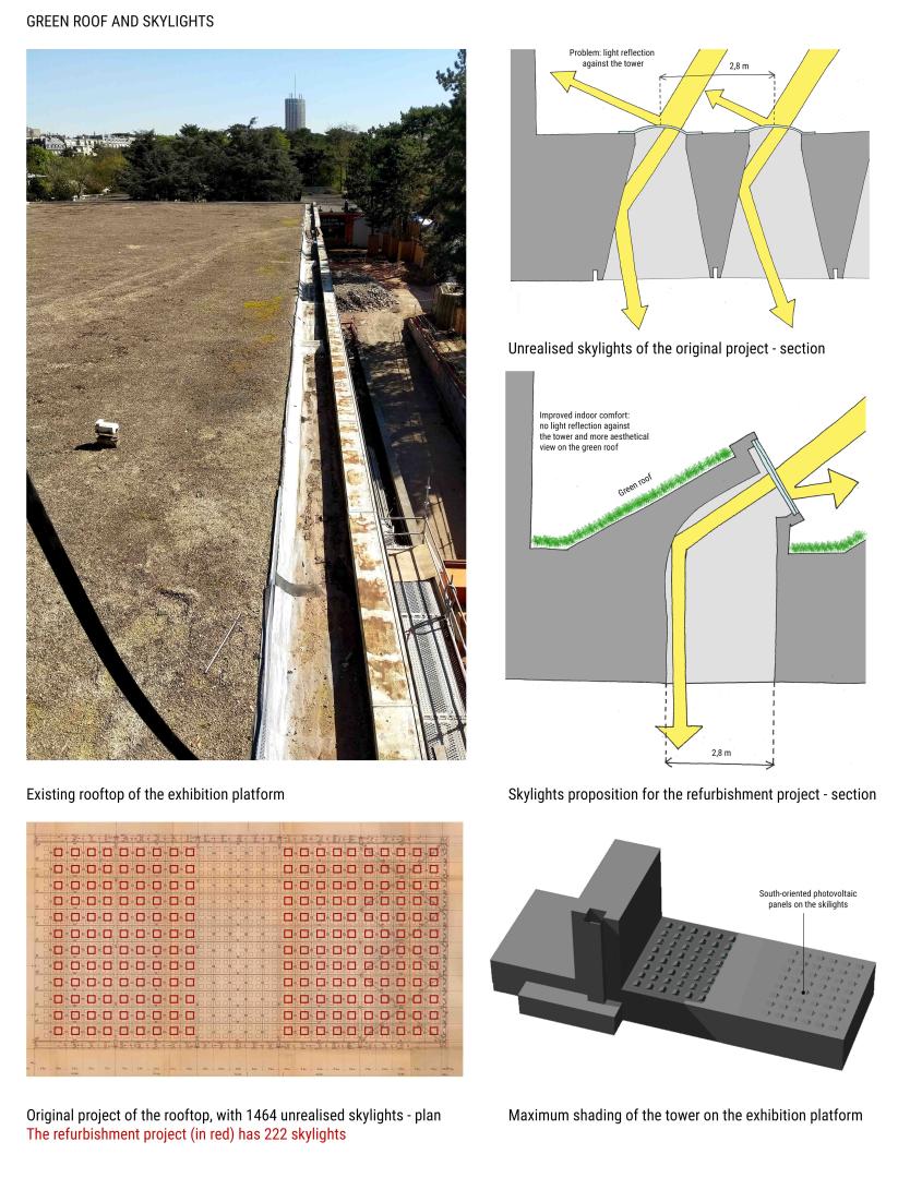 Depending on the orientation of the façades, different solutions have been applied. For the east-west orientation of the tower's longitudinal façade, internal shading operates in winter, allowing the entry of thermal energy. In summer, electrochromatic glazing darkens the glasses to avoid glare, to mitigate interior light and to minimise cooling consumptions. To ensure sun-shielding, the opening of windows adopts parallel hinges. The south façade, exposed to high solar radiation, has a double skin with internal motorised slats. In summer, natural upward ventilation and shading is allowed, while in winter the slats close to store heat. On the north façade, exposed to cold winds, triple glazing reduces heat loss. The skylights from Dubuisson's original project have been reintroduced in the exhibition platform, changed in their morphology and sizing, allowing illumination for the exhibition spaces below. For those far from the tower, not affected from its shading, the opaque slope is turned to south and covered with photovoltaic panels.
