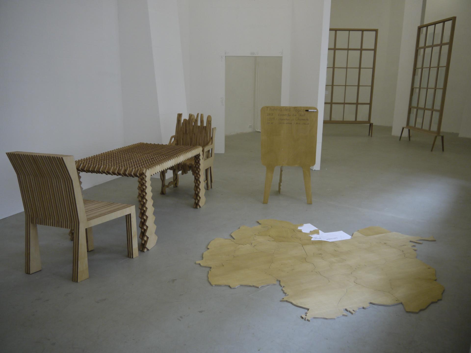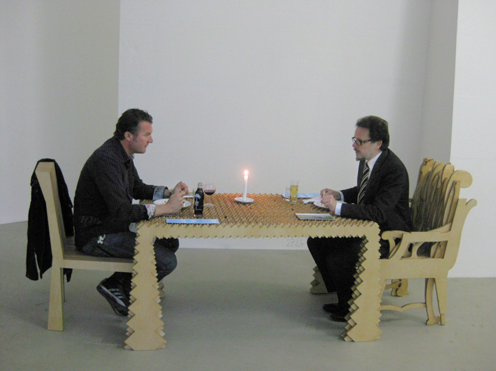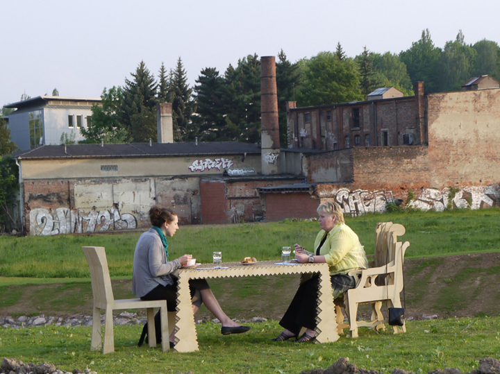 A set of two chairs and a table were installed at several public locations across the City of Chemnitz throughout one month, as an episode within the group project, ‘Rearranging the City’, curated by Pfelder and Simone Zaugg. At each location, a politician and a commoner were invited for an exclusive three-course meal. This public intervention creates a platform, which offered in addition to the culinary delight, dialogue among people, which otherwise would not meet; exchange of their views and intensively discuss topics that are urgent and relevant to their city that ranged from culture, politics, economic, closing down businesses, social gaps to city history and development. Menu with proposed topics was handed. Summaries of the conversations and documentation of the dinners were displayed simultaneously at Weltecho in a setting of audio-visual installation in progress. A blog was launched; it included an introductory page, news and documentation about the project and an open submission for the public to reserve dinner with politicians. Many individuals and institutions were contributed to the project free of charge, including local restaurants which prepared the dinners.