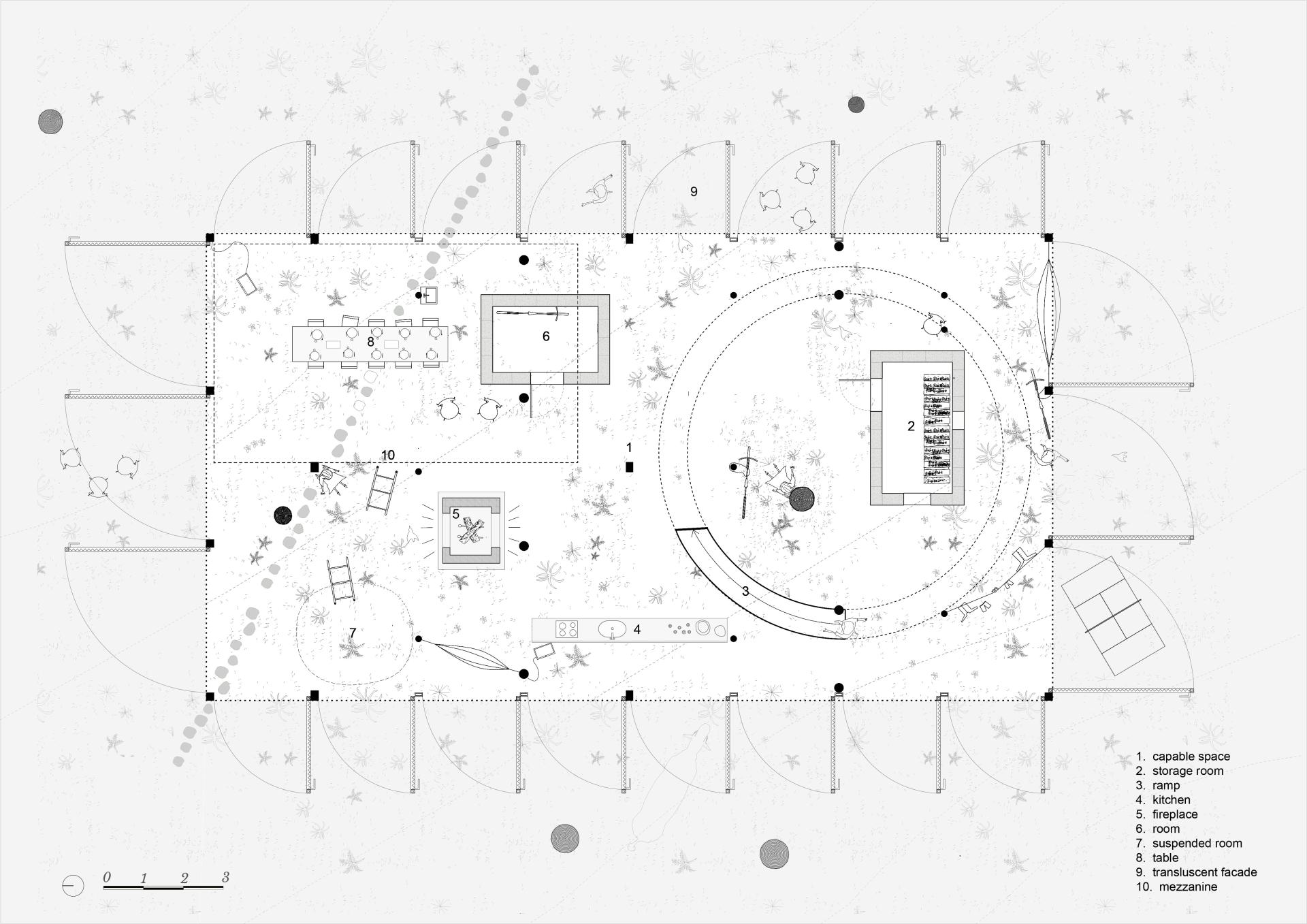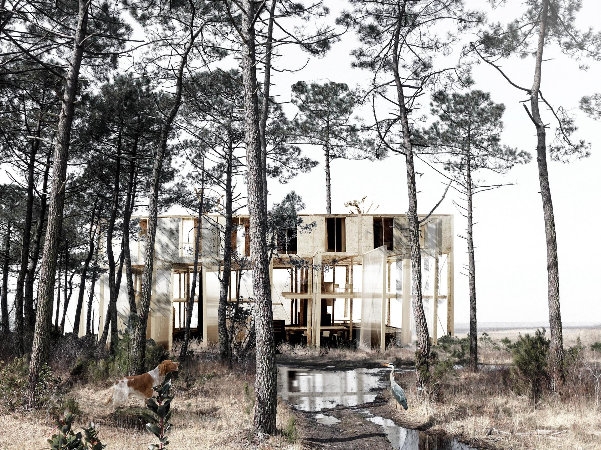 New Landes Residence is a revolutionary residence imagined in SANGUINET, Landes (France). This residence is intended for a small group of friends for coliving, vacations, and teleworking. This Landes Residence takes place directly inside the pine forest, close to the lake of Sanguinet, and the Atlantic Ocean. It does not eliminate any living earth parcel but composes directly with the rough ground of the existing earth. It is structured as an “all purpose shelter” built with a wooden and local forest pine skeleton. It offers super generous and capable spaces on the low part, and a compact intimacy with private rooms on the upper part. It does not impose any use, it suggests an infinity of possibilities. The residence is an innovative renovation of the old traditional Landes farmer house. It enthusiastically brings back old and forgotten low-tech devices such as compactness, filling construction, fireplace heating, sourced resources, community life, dirt floor, or even the coexistence of human and animals under the same shelter. New Landes Residence is built with an insulating bio sourced concrete made with pine needles picked up in the campsites around the area. This material has been patented since 2007 by a regional mason called DIDIER CUSSEAU, who is currently looking for new development. The collection of the material has a great impact on the environment, it participates in reducing fire hazards in the region and cleaning the forest and camping areas. It suggests new lifestyles in relation to climate, seasons and non-humans. The classical boundaries between inside and outside are erased by large translucent doors that can open in the forest. New Landes Residence embodies inclusion as a manifesto. A suspended ramp allows everybody to come up in the upper part of the residence and gives access to a circular shaped and collective terrace designed for the gathering of the community.