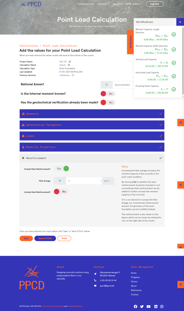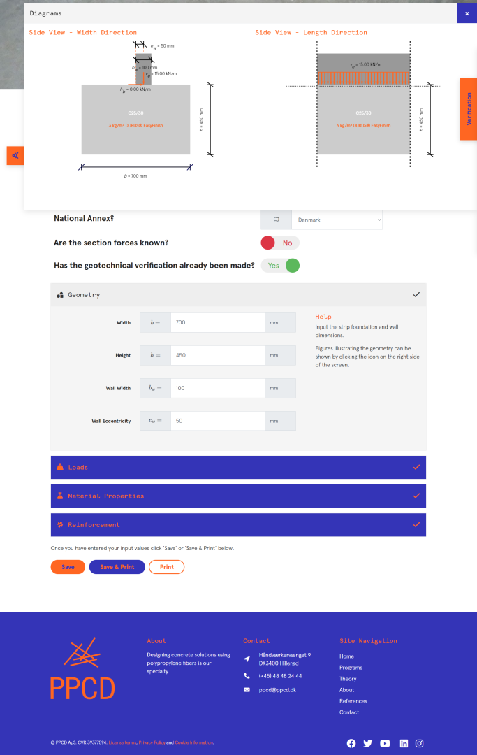 PPCD has developed programs that examine and verify the bearing capacity of the types of constructions in question, for all loads, internal forces and scenarios, using a minimum of input fields for ease of use. Moreover, documentation is autogenerated that clearly illustrates the input parameters, prerequisites and calculations. The idea is to create a clear-cut and operational interface that makes it easier to make an optimized design where the use of conventional steel reinforcement can be avoided or reduced by the use of the more environmentally friendly polypropylene fiber reinforcement. The workflow, overview, and file management are enhanced by the programs all the way from input to output by the use of helpful figures, symbols, and databases.