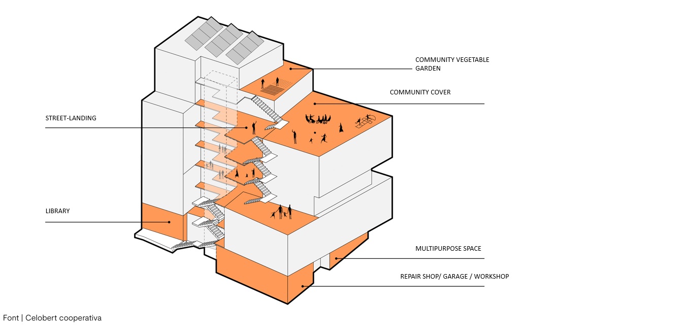 -Architectural level. It is an architectural building that offers community spaces, new ways of city living. Cirerers has communal and collective areas and private use spaces. The collective and communal zones gives the project its meaning and identity. These spaces have been the core element in the architectural co-design process. These different spaces are open areas to the neighbourhood (like cooking school), community use spaces (bicycle parking area, library) and community outdoor spaces (play areas, orchards), collective use spaces (shared laundry) and private areas (homes).