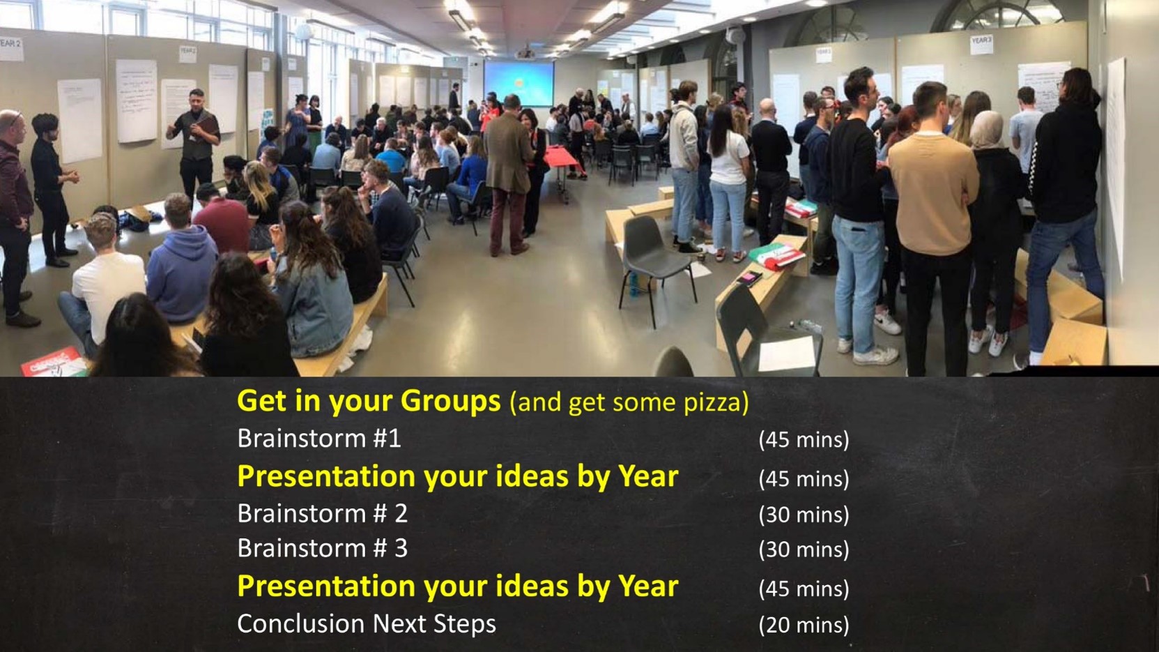 The aim of the workshop was to review and revise the Architectural Design Studio modules across the five years of the Bachelor of Architecture programme and elevate and empower student voice in the process. Of the five groups designated by years 1-5, each was composed of two student cohort subsets – approx. 25-30 students currently attending that year and 25-30 students in the subsequent year of the programme. Each group also contained the lecturers from the Architectural Design Studio in that year. The groups were each facilitated by different external participants, each with expertise in an area of sustainability. The role of external participants was to capture the group’s ideas, ensure equity of voice from all group members, and oversee the idea-funnelling process.