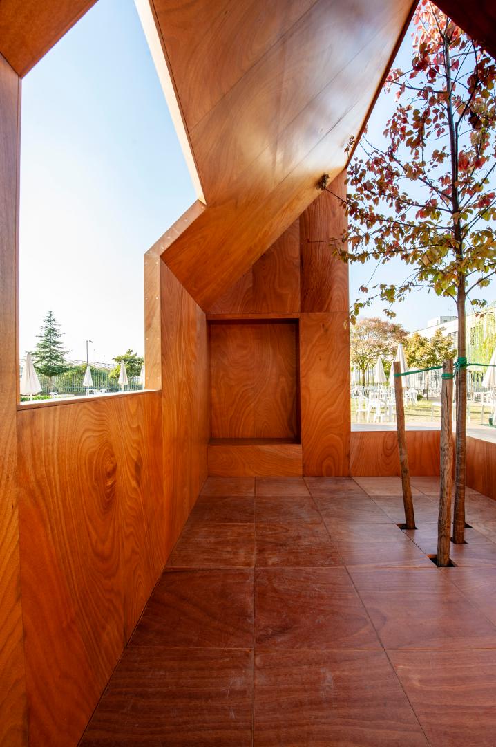 The Pergola is a comfortable and suggestive place to meet on sunny days due to the dynamic play of light and shadows generated by the wooden sheets.