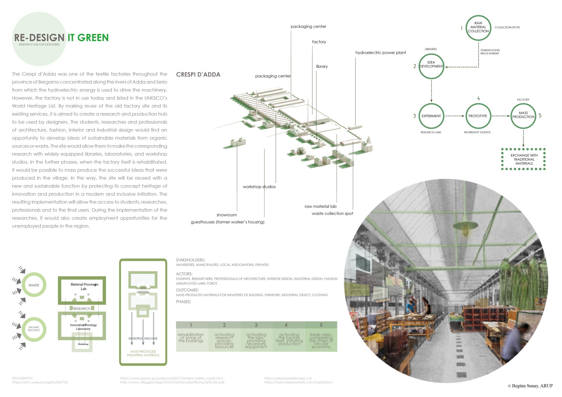 The Crespi d'Adda was one of the textile factories throughout the province of Bergamo concentrated along the rivers of Adda and Serio from which the hydroelectric energy is used to drive the machinery. However, the factory is not in use today and listed in the UNESCO's World Heritage List. By making reuse of the old factory site and its existing services, it is aimed to create a research and production hub to be used by designers. The students, researchers, and professionals of architecture, fashion, interior, and industrial design would find an opportunity to develop ideas of sustainable materials from organic sources or waste. The site would allow them to make the corresponding research with widely equipped libraries, laboratories, and workshop studios. In the further phases, when the factory itself is rehabilitated, it would be possible to mass-produce the successful ideas that were produced in the village. In this way, the site will be reused with a new and sustainable function by protecting its concept heritage of innovation and production in a modern and inclusive initiation. The resulting implementation will allow access to students, researchers, professionals, and the final users. During the implementation of the researches, it would also create employment opportunities for the unemployed people in the region.