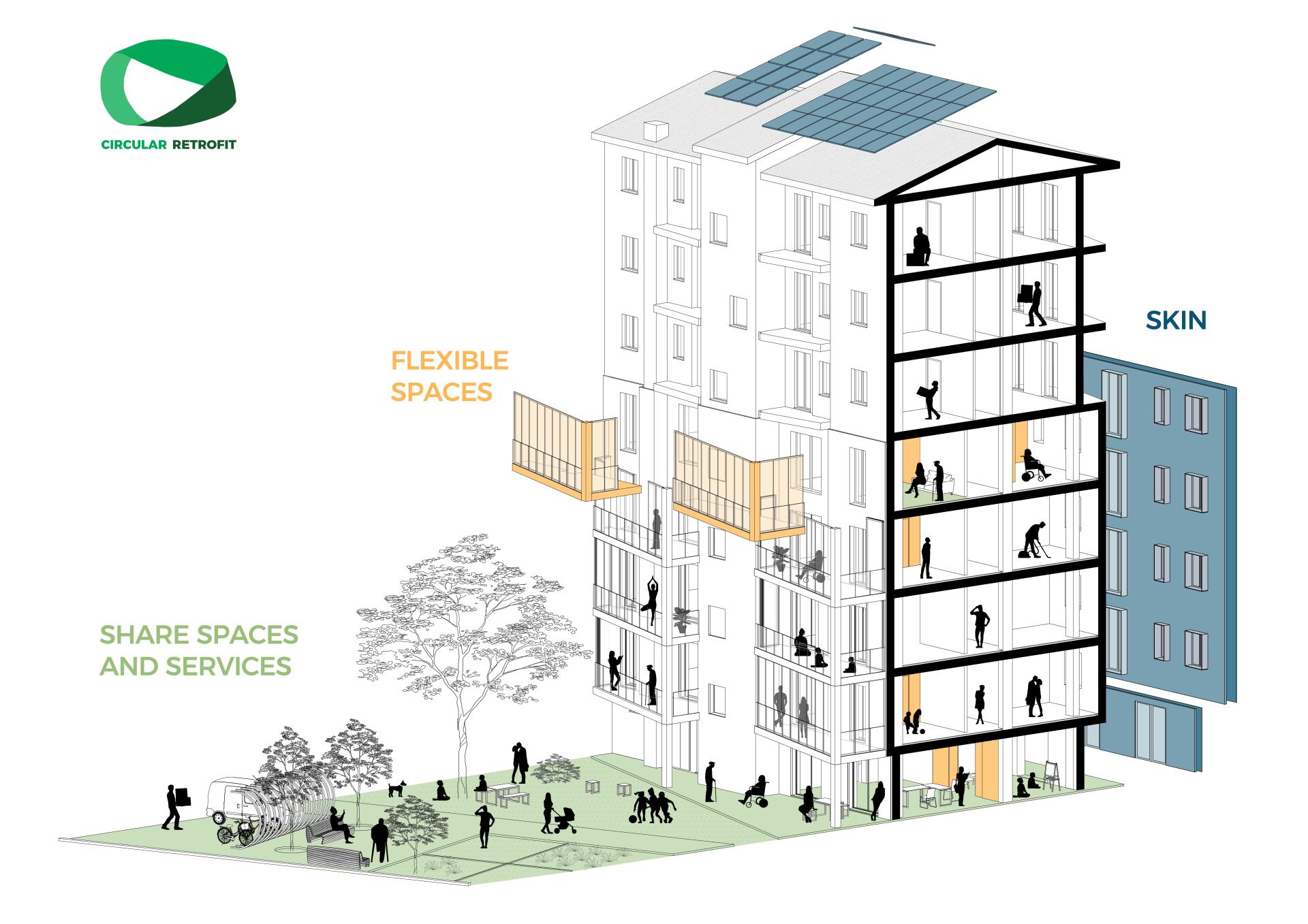 The core ideas of the project research are the circularity and the sharing of the resources used in the retrofit. The main retrofit actions are: the implementation of a second skin that includes solar panels, the design of new reconfigurable flat layouts, the addiction of flexible spaces to transform living spaces and the façade image, the creation of new shared services, spaces and green areas.