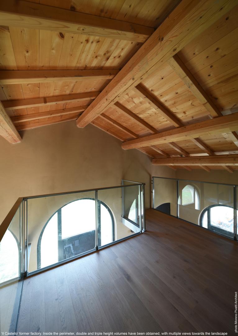 The building object of the intervention constitutes the housing and production section of the historic court called “Il Castello”, located where the Alto Ferrarese area fades from the Modenese valleys, between provinces related by family, “frontier land” with precarious hydraulic balances. The project provides the recovery of the mighty barycentric building at the court, one hundred meters long and resolved in the expansive articulation of eight lateral modules joined by five aerial central arches. The restoration of the former factory has combined the aspects of strengthening and seismic improvement of the structures with those concerning the critical rereading of the material text, in order to restore the semantics of the construction schedule. The unitary character of the building suggested wearing the homeopath’s gloves, recovering it from the outside to its harmonic image and obtaining uses within it that are compatible and non intrusive. The structural solution refuses to show itself in order to silently harmonize with the architecture. Respect for environmental values, even the most prosaic, leads the project to develop almost exclusively within the volume, emptying it and reconfiguring it; outside, only a few calibrated “scalpel blows” are allowed, the one necessary to restore the history of the building. Inside the perimeter, on the order hand, double and triple height voids have been obtained, with multiple views, without however distorting the share of decks and ‘rediscovered’ windows. From the balcony-study obtained in the mezzanine, the free spaces are dominated within which the staircase climbs and the living room develops, from the respective decks, through the existing windows and the reopened arched ones, you have a “long view” of the infinite countryside. The partial emptying of the internal volumes allows the amplification of the spaces, in depth and in height, giving the sense of a confortable home.