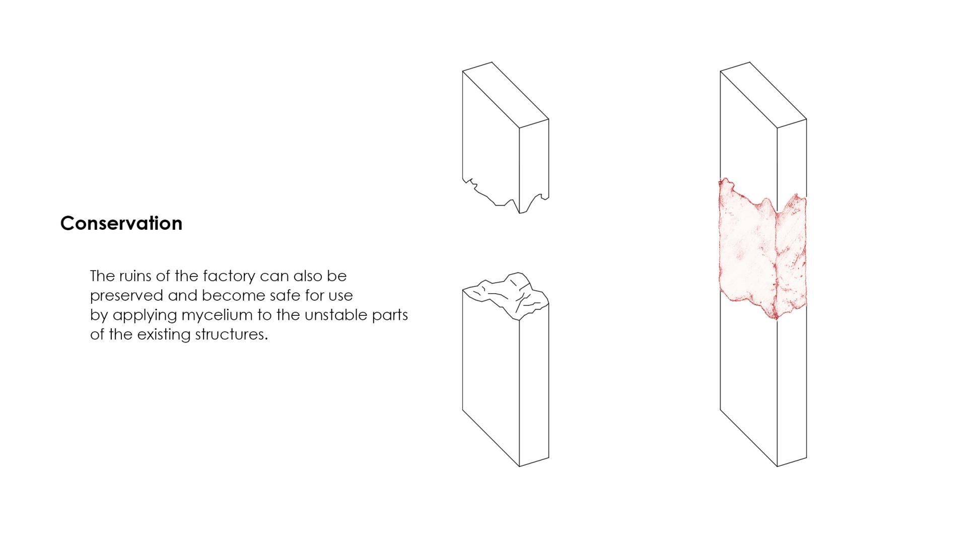 The ruins of the factory can also be preserved and become safe for use by applying mycelium to the unstable parts of the existing structures. There is no additional maintenance needed for the new structures. At places not accessible by or posing danger to the visitor, old material is untouched and gives way to new possibilities in time.