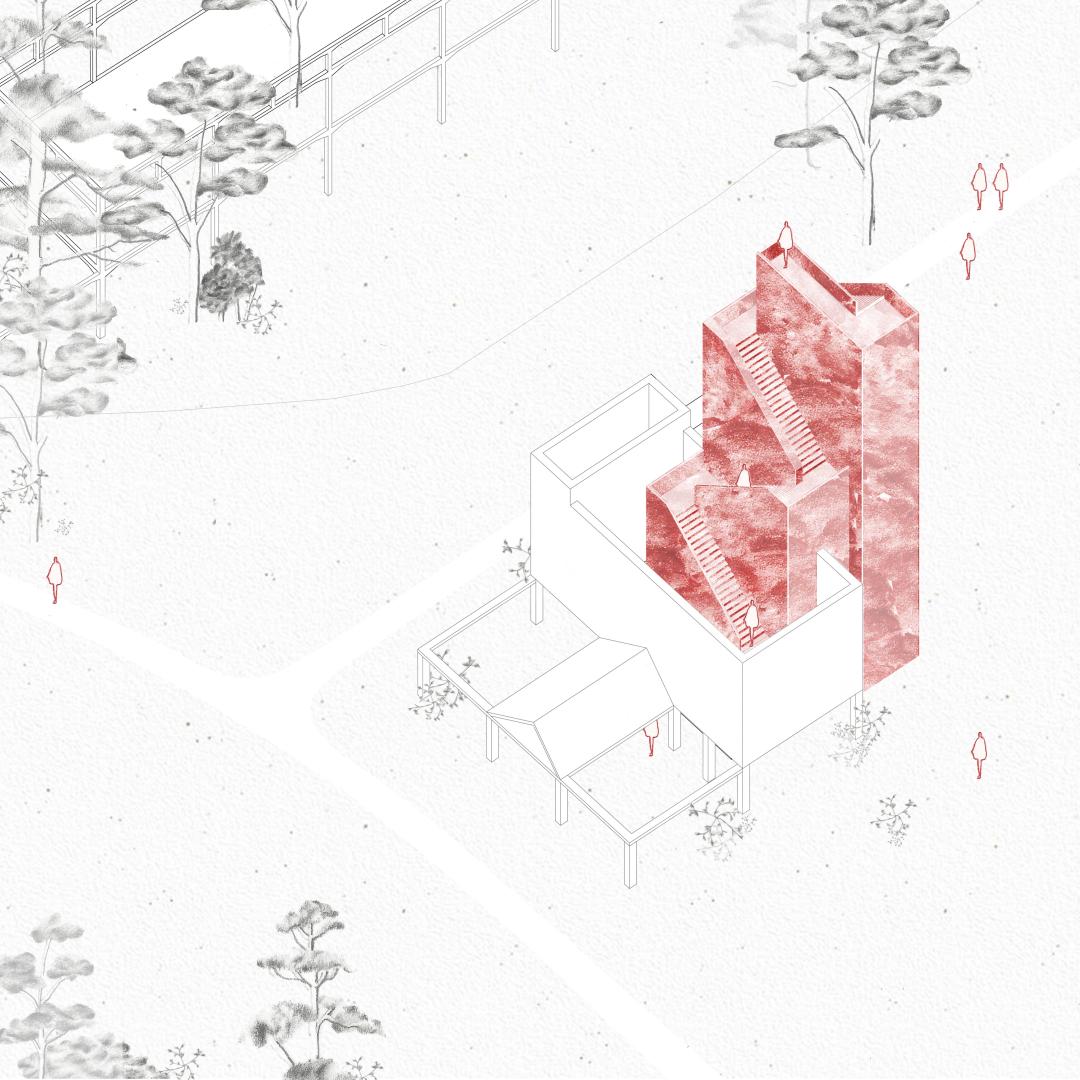 - A tower-like structure grows with and on the highest three-story building in the middle of the compound. The big structure reveals different phases of co-existence between nature and man and focuses on individual instances along the way towards the top of the structure. Once the visitor reaches the top, the nature that was created by human failure is in the center of attention.