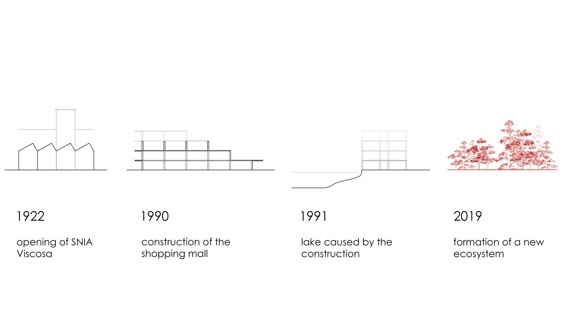 In the 5th municipality of Rome, via Prenestine became a place of industrialization after the First World War. Because of the restructuring of the center of Rome under the fashist regime, thousands of people migrated from the city center to the residential complexes around the municipality of Preneste and new industrial complexes such as the SNIA viscose factory opened, and were closed short after the war, due to the economic struggles. The big complex of the SNIA viscose factory had been left untouched for over 30 years until the construction for a new shopping mall on the upper part of the area started. The construction had to be stopped after creating a lake by illegally drilling and hitting a spring water source underneath the site.