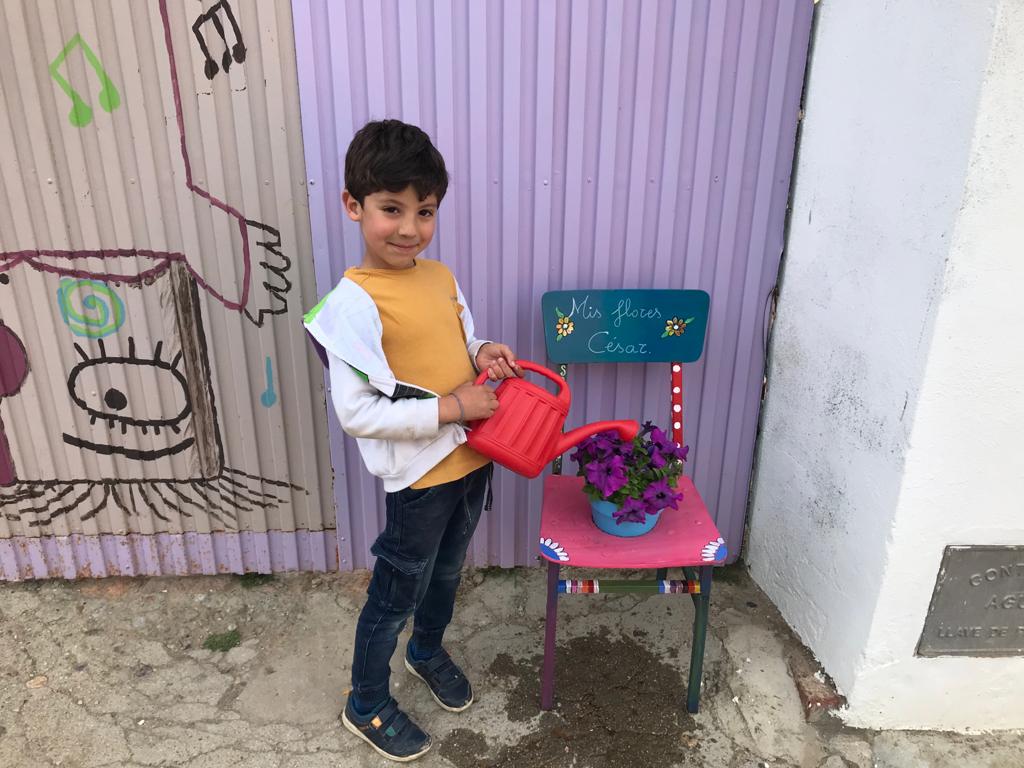 As for the chairs, the original idea was found on social media but we contribute the use of recycled materials and the children implication on the care of the plants. It is an innovate approach of the Association.