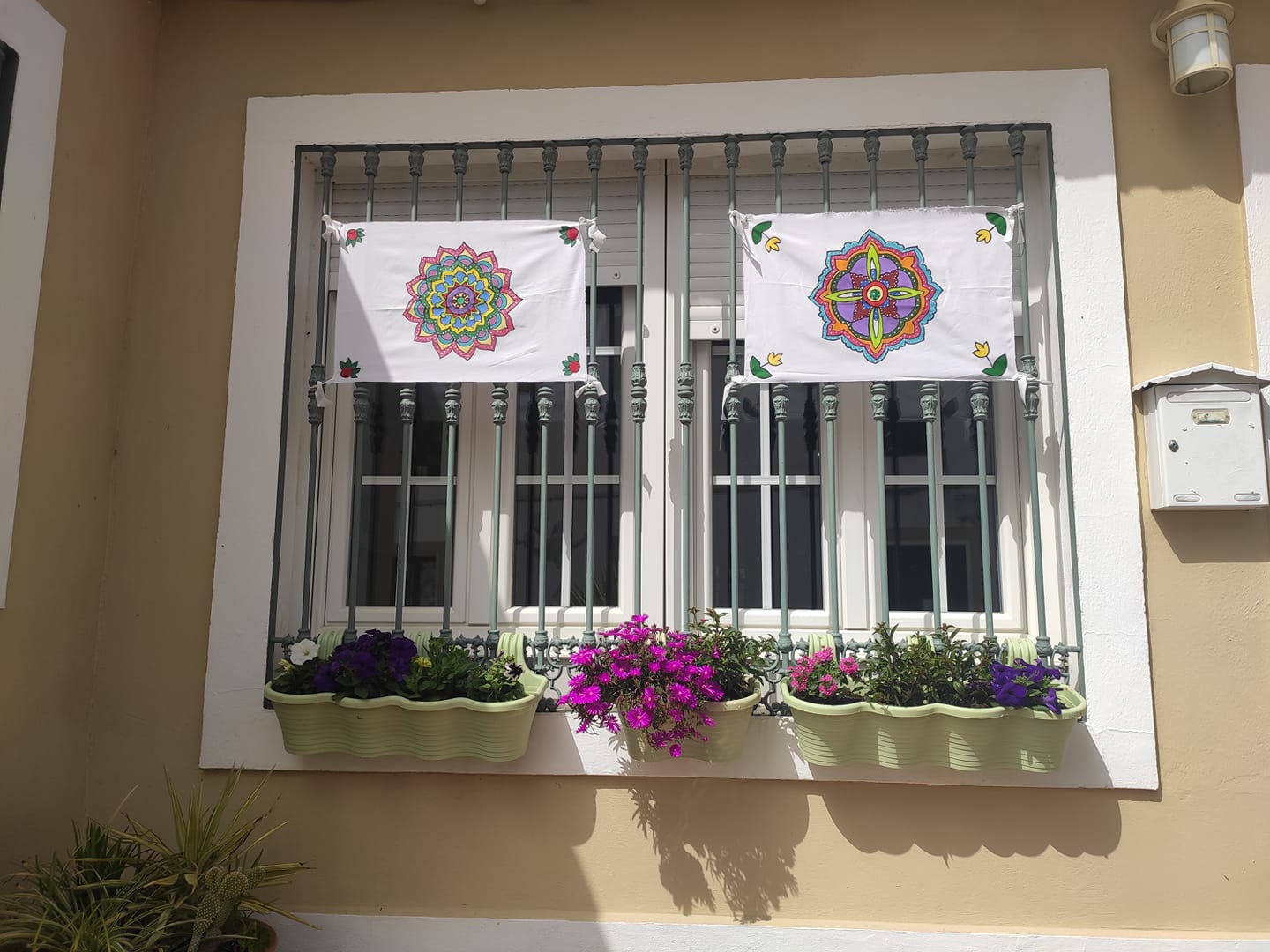 The awning is made though the year. Because of the first state of alarm, the surgical material stopped arriving. Resulting in the neighbours deciding to reuse the fabrics of their own houses to continue making mandalas, making them feel more productive in those hard times. To give the village a more cheerful image and overcome with joy the situation, the neighbours started to hang the mandalas on every window and balcony. This way, the second initiative started. Although it is already possible to go outside, people have continued making mandalas because they considered it a gratifying activity, entertaining and now are demanding for more activities.