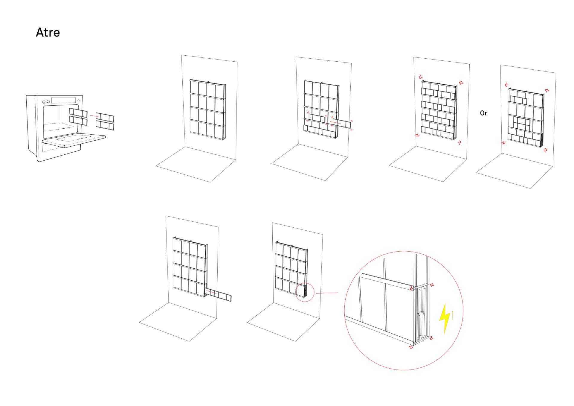This project aims to optimise energy consumption in domestic uses. Various clay bricks are placed in our (standard) oven while it is in used to cook food, they are heated during the process, and then removed using a suitable tool and placed on the Atre structure, made also from materials that can diffuse heat, becoming a heating device. Or put inside a compartment made of a thermoelectric material, converting heat into electricity, stored and available when needed.