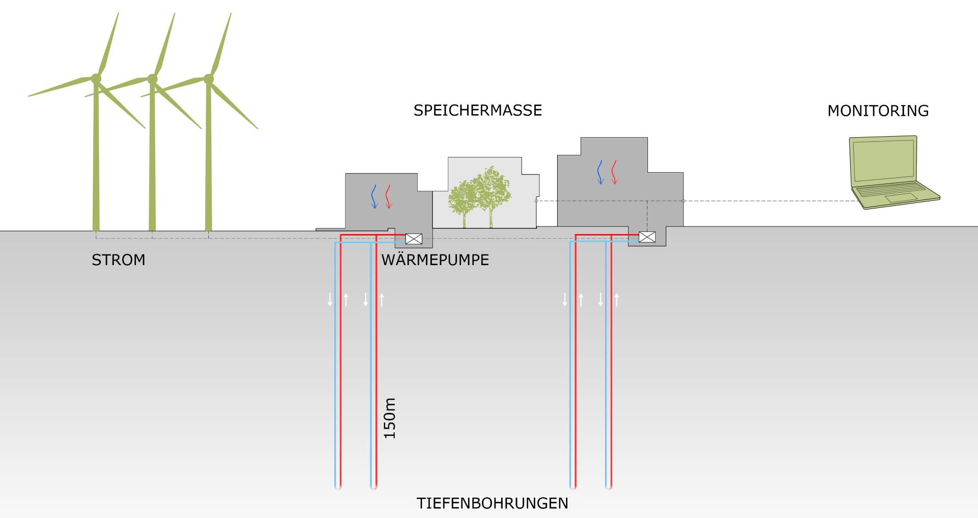 100 % renewable energy, using geothermal heat and thermal component activation as storage, leads to extremely cost-efficient heating and cooling temperature control with low primary energy consumption.