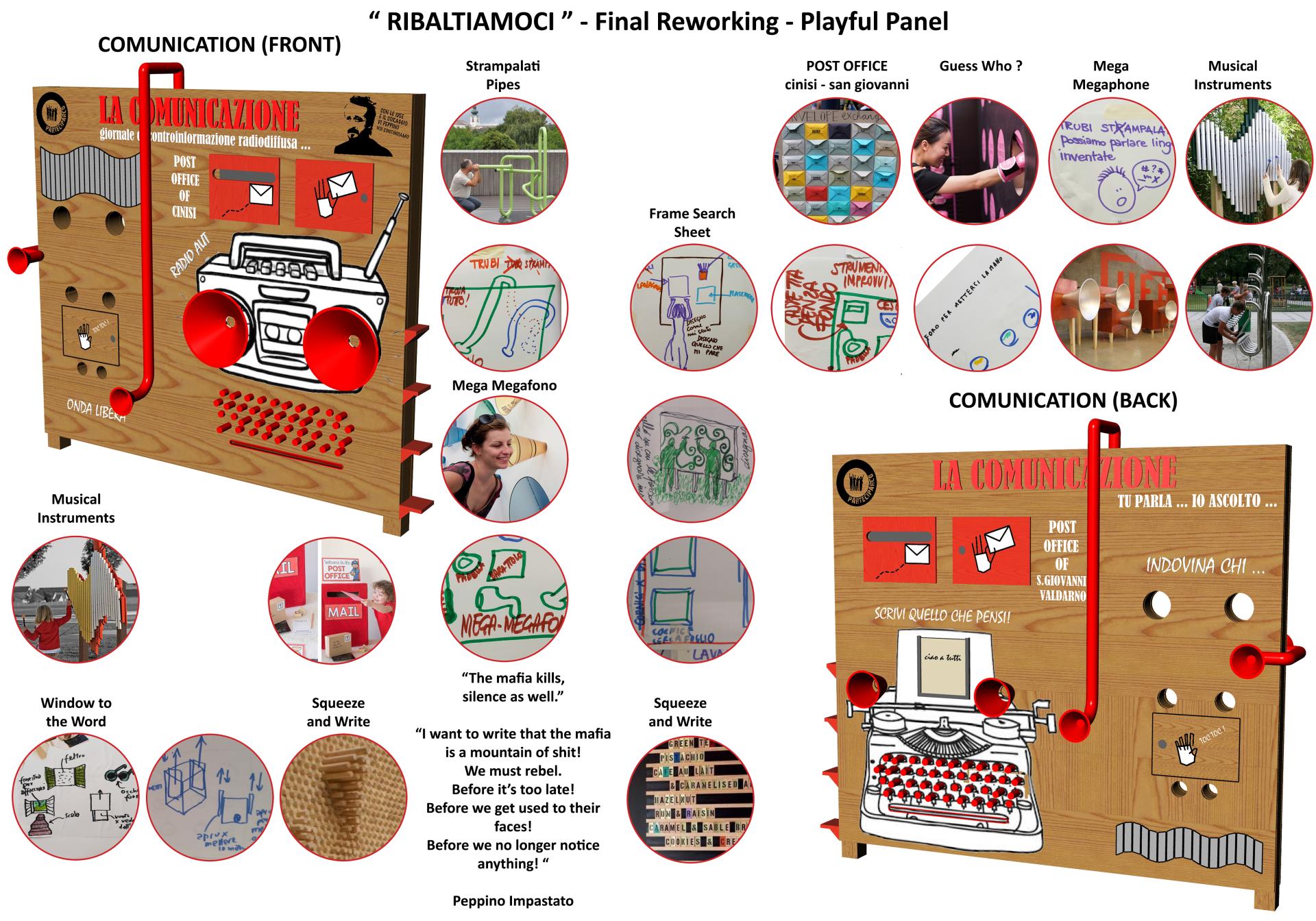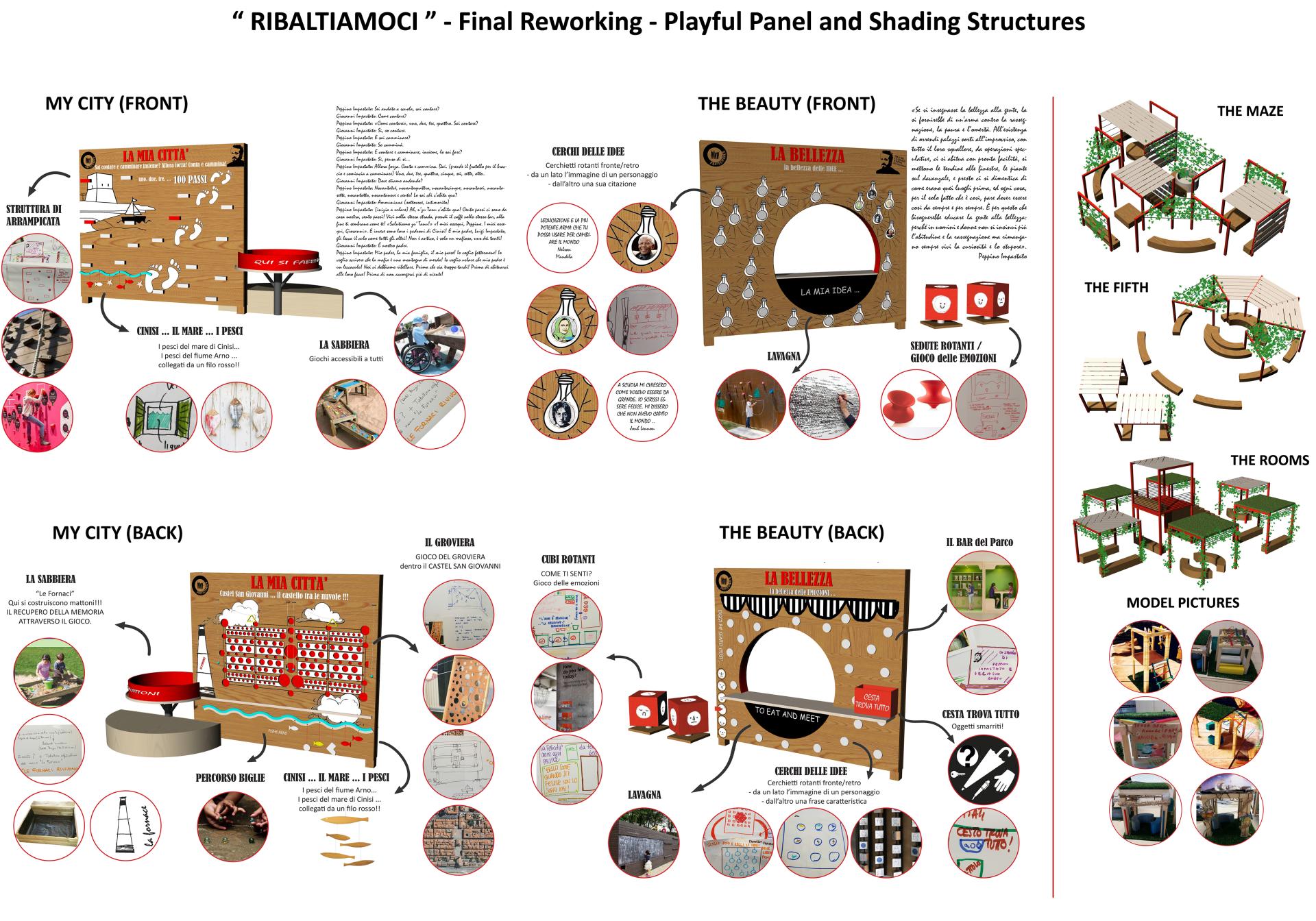 So far, RIBALTIAMOCI has completed the preparatory stages for 3 shading structures and 1 playful path composed of 6 interactive play panels. These results were achieved through a participatory process that involved contributions from administrations, associations, citizens and children, thus enabling the project to respond to the needs of citizens. Playful panels and shading structures are the result of the vision, imagination and work of a community, therefore they represent it in a unique and concrete manner. Other experiences will produce different results both from an aesthetic and functional point of view. Memory also becomes a promoter of beauty. The values of Peppino Impastato's life sets a good example for how the people of S. Giovanni Valdarno can be involved, active and care about their own community.The aesthetics of the artefacts acquires greater value with the quality of the experience through participatory planning and implementation: this process offers the possibility to respond to the needs of citizens, to create communities and conviviality through play and being comfortable together. The furnishing structures, and in particular those of the designed play path, include elements (images, phrases) linked to Peppino Impastato to instill an identity to the place and allow citizens to reflect on the fundamental themes of our society (legality, community, civil responsibility).