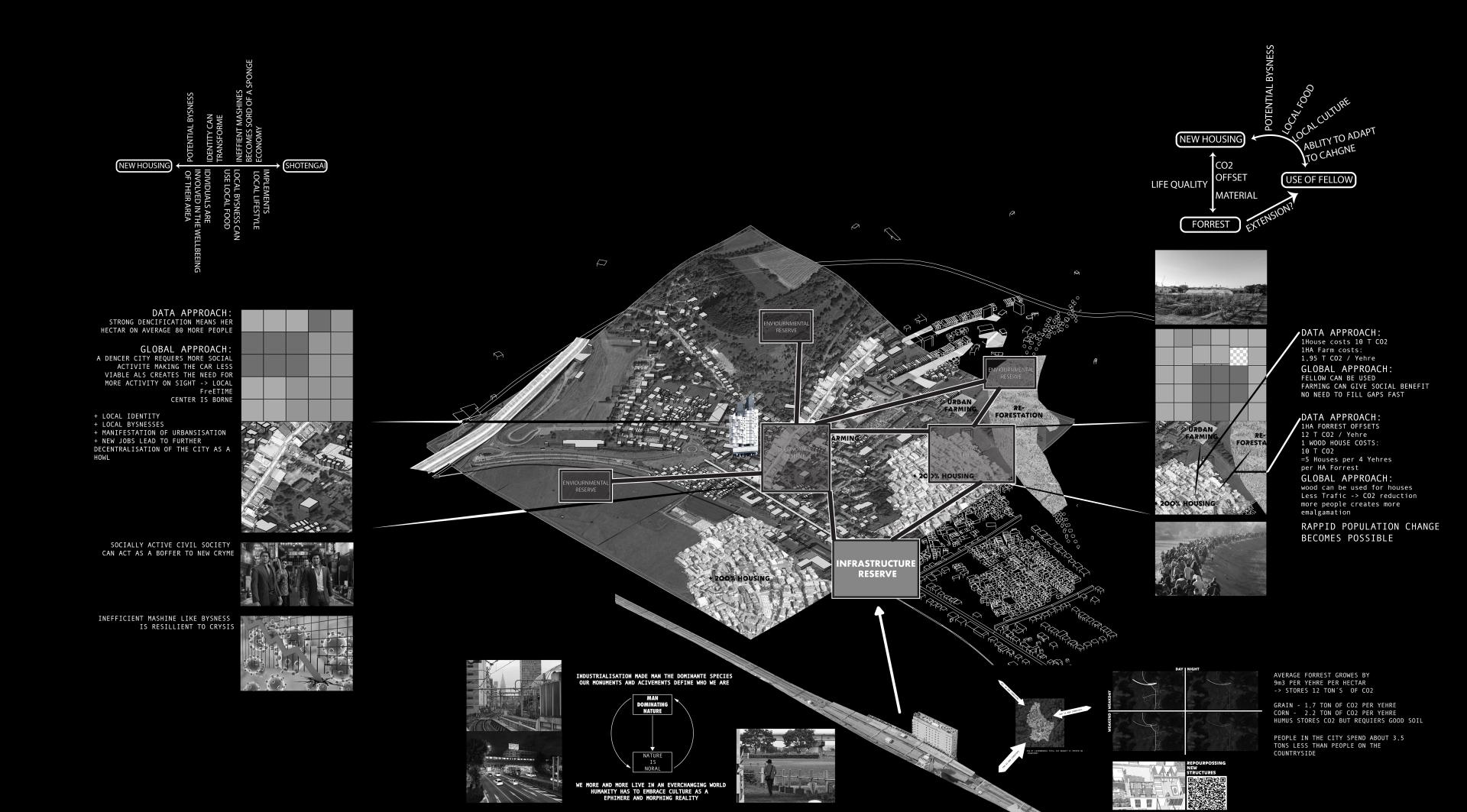 In the concept at hand I use architectural methods to combine a large-scale trend analysis with architectural interventions that work as an urbanistic project, but simultaneously also as a coordinated strategy.