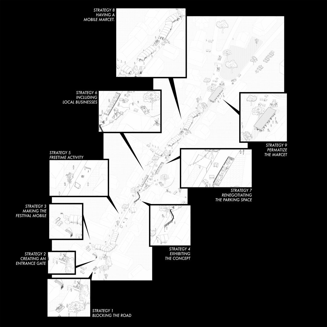 My project only gets an immediate architectonic form in the shape of the festival it is important to communicate the ideas social aspect, by the integration of the village only bar, playing options for children as well as the temporary urban furniture that permits cars from driving. I choose an industrial aesthetic (the expandable tents, and the fences) and combined it with playful DIY elements, to visually communicate the idea of symbiotic nature and technology.