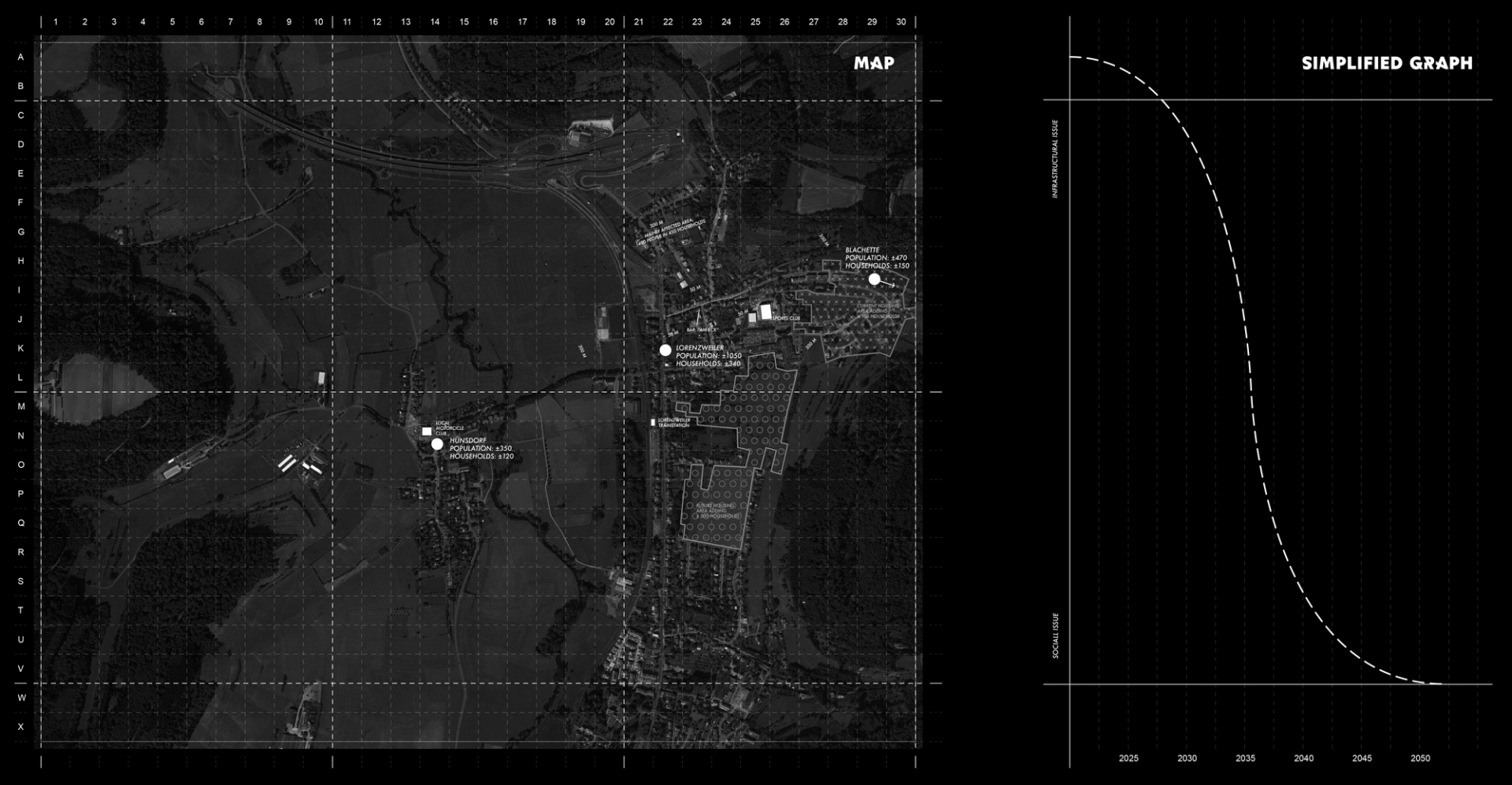 The metabolistic approach aims to develop a strategy of ecological transition through the redevelopment of infrastructures. To root Lorenzweiler's strategy of overall transition, I began by conducting a graphical analysis of key trends in Luxembourg’s immediate future. The different trends were arranged in graphs, indicating their overall importance over time.