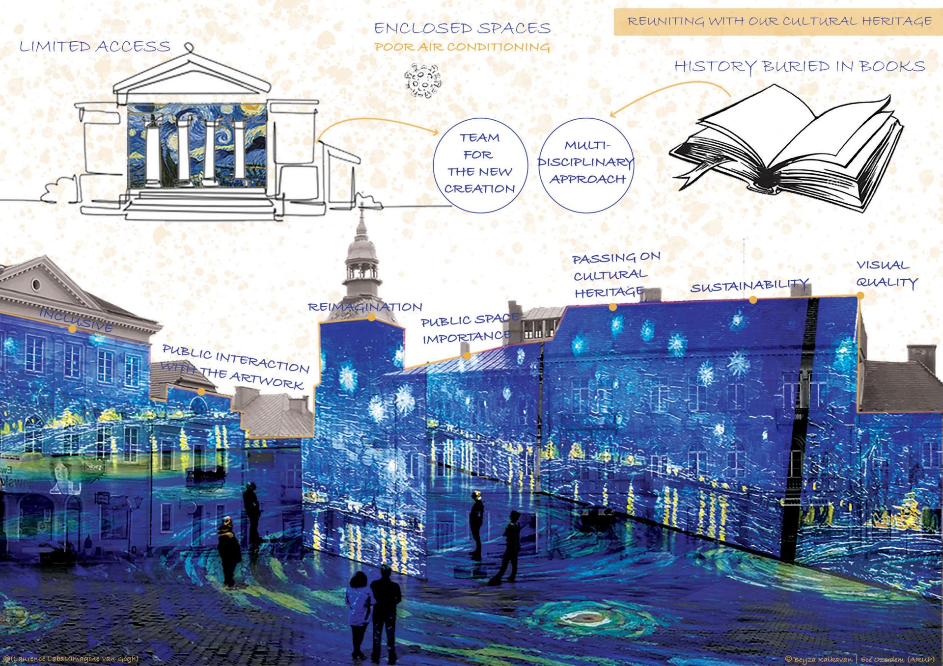 Towns that we are living in were homes to many other people before our time. There were painters, authors, composers and many other artists who created their artworks while living in the same places as us. Sometimes our towns were backgrounds of art pieces, sometimes they were a character in a story. All this history created a cultural heritage that should be preserved, protected, and shared so it can live on. Museums and libraries are wonderful places, and they do a great job of preserving and protecting. But how about sharing? What if we help everyone to interact with historical artworks in a way that is new and exciting? We propose to choose historical art pieces, like paintings or sculptures from museums or books from libraries, and reinterpret them with a multidisciplinary team of students, academics, art historians, designers, artists, architects or anyone who wants to join in. This team will come together and communicate via a digital network. The reinterpretation will then proceed to become an artwork on its own as a light installation. These reinterpreted artworks will have no boundaries or limitations as they will be set in public spaces for everyone's gaze. Years ago public spaces were the places for people to meet up and interact with each other. They were the heart of the city. As time passed, this habit slowly faded out of our lives. However, when Covid-19 hit we realized how important it is to have open air spaces to spend our time in. Our project aims bring town squares their old glory back by turning them into places where people can come together and enjoy a cultural activity. By using the latest technology, we plan to create ways of personal interaction with the artwork such as an online vote for which artwork to choose next. This would also provoke curiosity in people to learn more and lead them to museums and libraries, helping these places become more popular.
