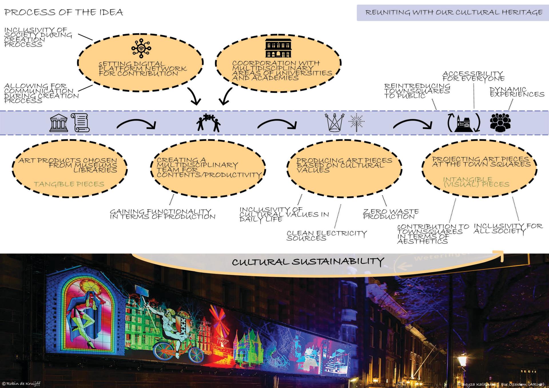 Reinterpreting cultural heritage will cause inclusiveness for them in society, daily life. Projecting light artworks at town squares enables a few aspects for inclusivity. Town squares were spaces for accounting, declaring and sharing ideas. In this project, using town squares has an aim that brings back previous features to societies in daily life. Town squares will have an impact on awareness of cultural heritage and carrying them into all segments of societies. Using town squares will also provide accessibility for people. In this way, anyone can experience these artworks with visualization. It will be receiving society's opinions for the election of the topics of artworks. That ensures participation and communication interactively by either creating artworks or projecting the process with the digital infrastructure to be created. People coming together from different disciplines during the production process will enable different perspectives to come together and create a versatile work. These multidisciplinary associations during the production process also will provide inclusivity in addition to the participation of people.