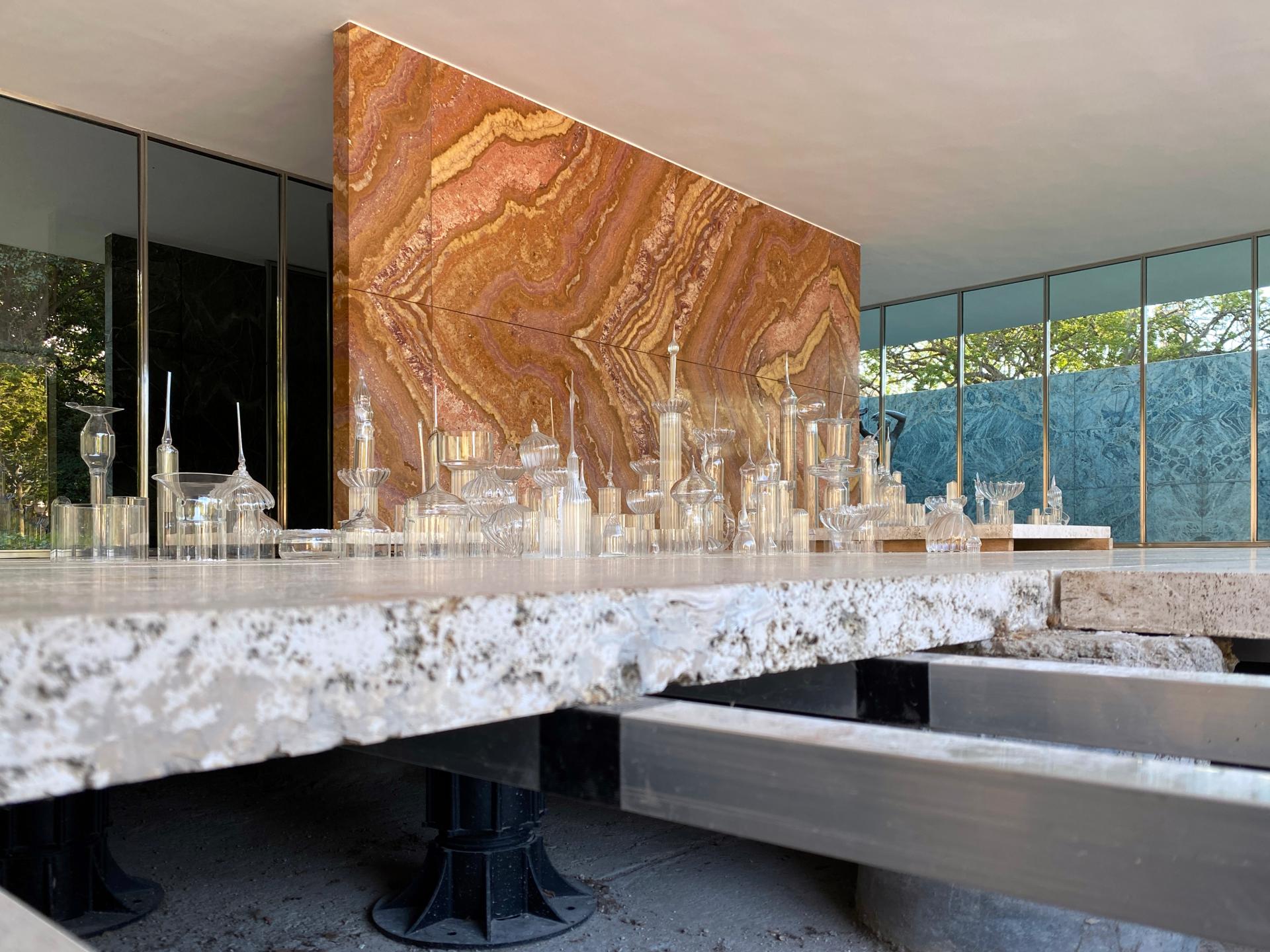 BEAUTIFUL FAILURES works on fragility, identifying the two most delicate materials of the celebrated Mies van der Rohe Pavilion, glass and the travertine of the pavement, to revisit this seemingly perfect architecture from its most vulnerable side. BEAUTIFUL FAILURES seeks a more inclusive and sustainable approach to our cultural heritage and material culture through re-use and re-reading, exploring the empathy generated by aesthetic attitudes that develop an affective relationship of care.