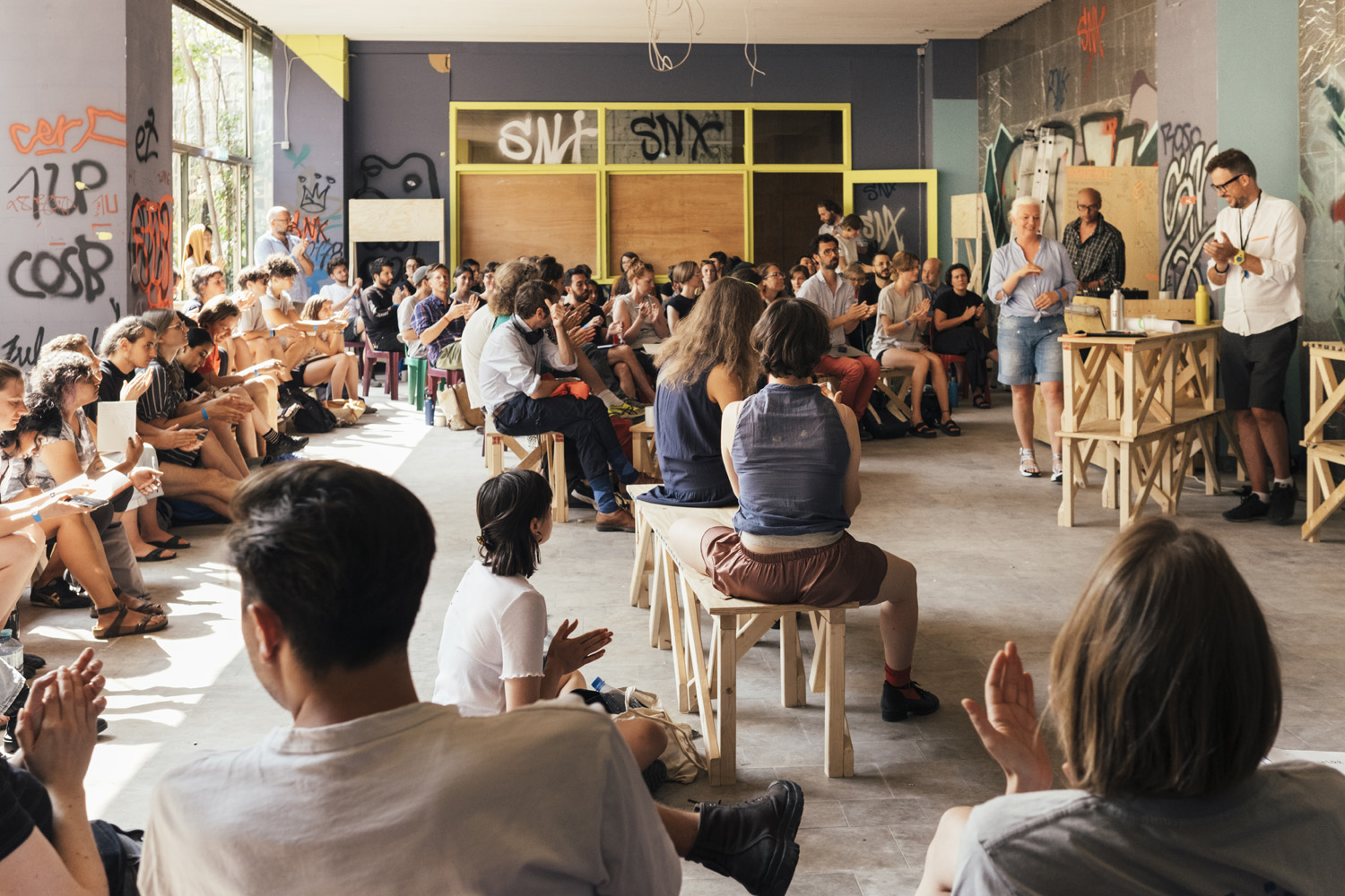 Over the course of two weeks, over 80 participants took part in a diverse curriculum convened by practitioners in the field of spatial practices. Acting as a post-disciplinary learning environment, the School proposes, designs, builds, negotiates, maintains, performs and celebrates an educational and convivial space in and around Haus der Statistik. At the same time, it becomes a dynamic actor within a process of urban transformation, serving as a common sphere of action between participants, neighbours and civic society.