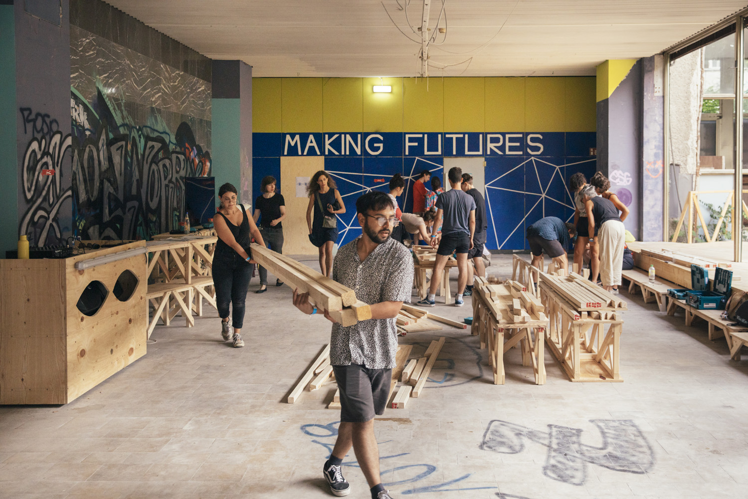 The infrastructure we built for the school was made from wood and scaffolding. The sleeping area for the participants was a multi-story scaffolding structure with tents. The scaffolding went back to its main use after the school and the wood structures continued their use either in the Haus der Statistik by later projects or in other projects and locations around Berlin. The kitchen was vegan, reducing the footprint of an event that fed over 80 people multiple times a day, with scarps being recycled or composted. The Making Futures School was built with a focus on planetary care with an awareness of depleting resources and a belief in limiting the schools environmental footprint.