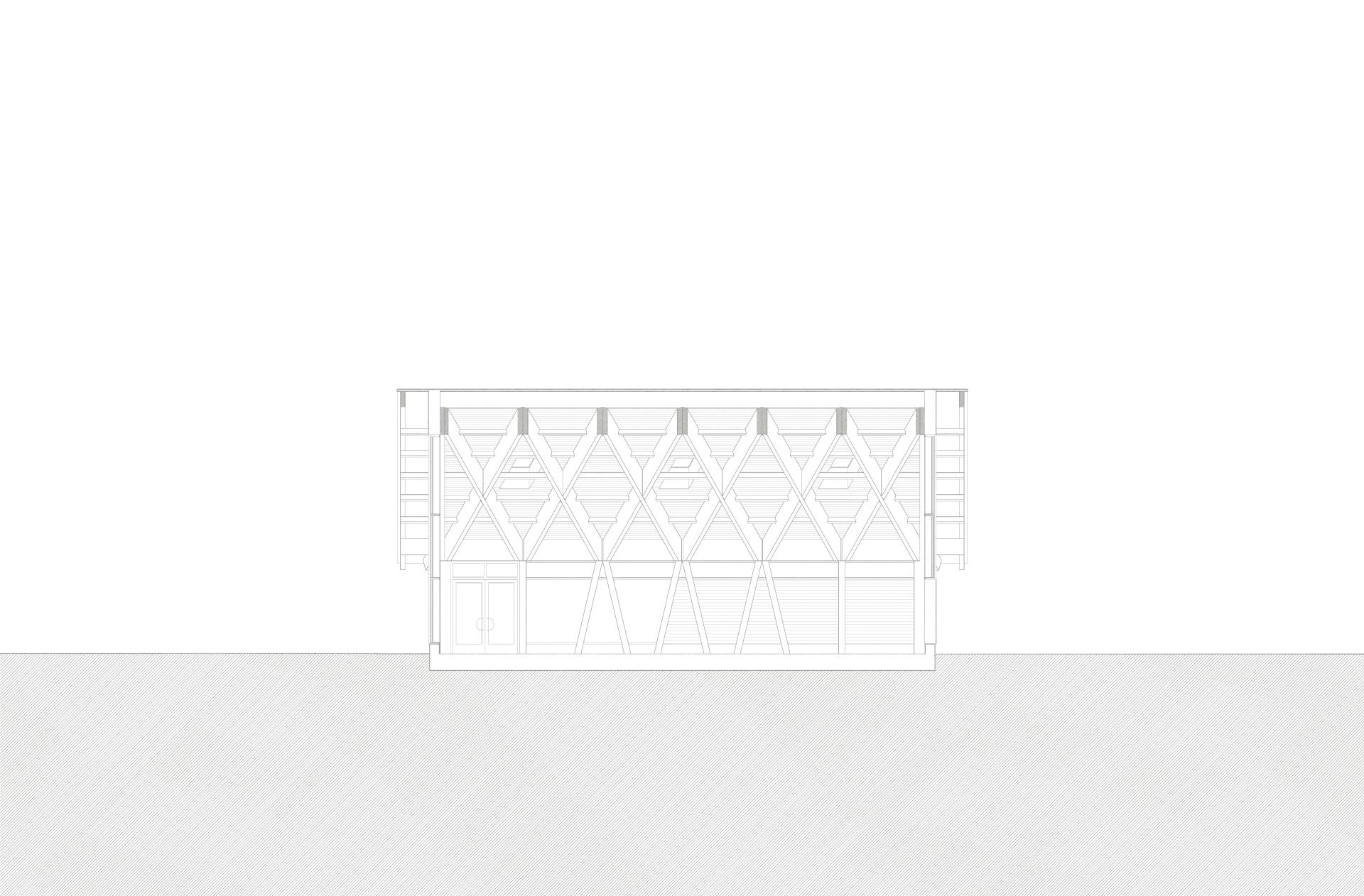 The form of the extension is simple; a generous roof with overhanging eaves echoing the serial roof structure of the existing Magnolia complex. The structural frame of the extension is made of prefabricated laminated timber elements, loadbearing columns and beams securing shear and lateral stability. The diagonal form of the carcass constitutes the unifying element providing the building with its distinct characteristics and detailing as well as creating a subdivision of the space. The floor is made of polished cast-in-situ concrete.
