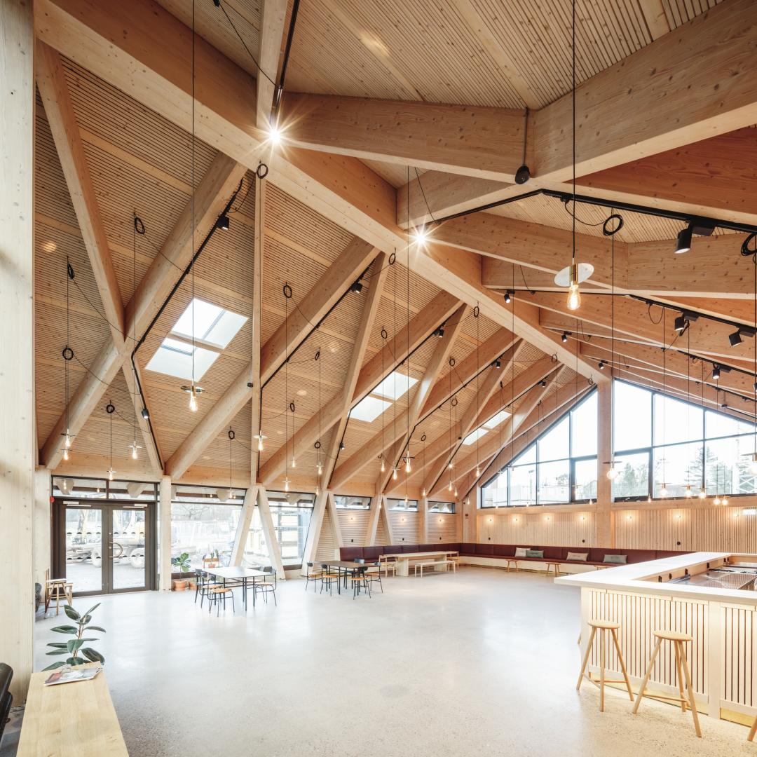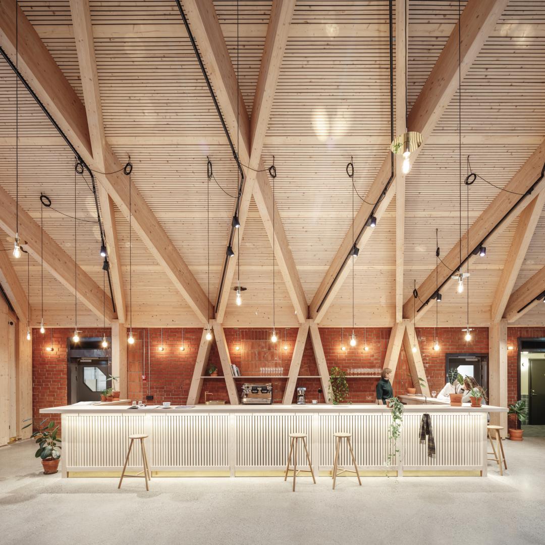 The extension of the Magnolia complex is designed as part of an ongoing urban development of Stora Sköndal in Stockholm. It will serve both as a restaurant and as a meeting place next to the new local square. Created by using wood as the main material it generates harmony. It ties the large open space together and contributes to a warm and welcoming atmosphere